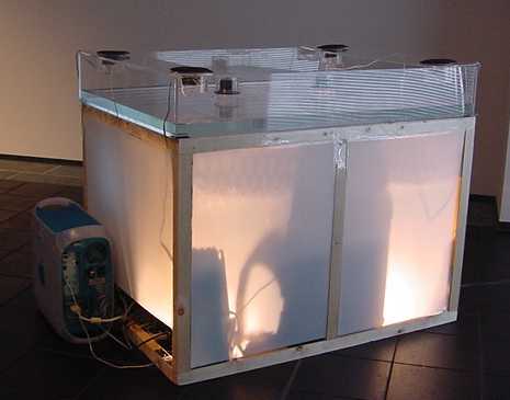 水槽には水面を振動させるスピーカがあり、周囲の騒音をセンシングして生成されるサウンドと水槽の下からの照明が組み合わされたインスタレーション作品。