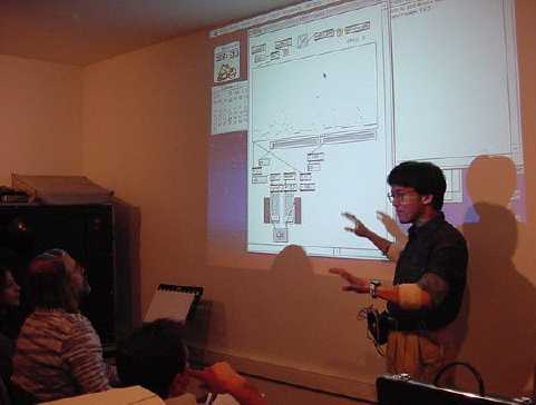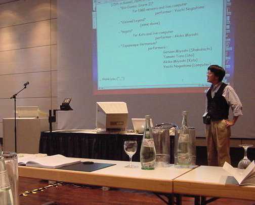 筆者は情報処理学会音楽情報科学連絡委員として音楽情報科学研究会の設立から関係していたこともあり、研究会ではSUACについて紹介するスタジオレポート発表をするとともに、既にインスタレーション作品発表やパフォーマンス制作を体験した技術造形学科学生の中から有志を募り、開学したばかりのSUACから、聴衆でなく作家としてのデビューを目指して参加(2000.12.16-17 東京工科大学)した。