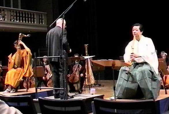 上図のように、この国際Workshopではプログラムの一部としてオーケストラのコンサートがあり、コープランド、ベートーベンのオーケストラ作品とともに、一行の三好芫山氏が演奏する武満徹の「ノベンバー・ステップス」(琵琶はアムステルダムで活動するJunko Ueda氏)と、東野氏が笙を演奏する筆者の作品 "Visional Legend" が公演された。以下はその準備および公演の模様である。