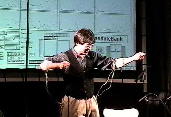 新開発した両腕16チャンネル筋電センサ"MiniBioMuse-III"を楽器として使用し、そのMIDI出力からMax4/MSP2によりリアルタイムに楽音合成したサウンドを生成する作品。