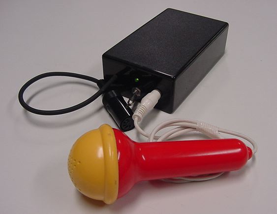 "Paper Session III"の3件目は、"Donna Hewitt, Ian Stevenson"による "Emic - Extended Mic-stand Interface Controller" の発表である。この2人のコラボレーションは、女性はボーカルパフォーマンスとしてマイクを使う、男性はそのマイクをセンサとして開発する、という組み合わせの研究である。考えてみれば、マイクというのは、ボーカルPerformerからの働きかけとして、撫でたり投げたり回したり叩いたり踏んだり蹴ったり握りしめたりテレミンぽく揺すったり・・・・と色々とアクションを受けているので、それなら色々とセンサを仕込んだ特製マイク(スタンド)という「新楽器」を作ってしまおう、という事であった。スタンドの台座部分のフットスイッチとかマイク側面のタッチリボン、マイクスタンドの傾き検出のジャイロだけでなく、マイクの根元付近に左右方向の超音波センサを入れて、両手を広げて表現する歌手の動きを取る、というこだわりはさすがである(図25)。