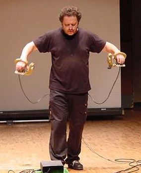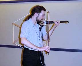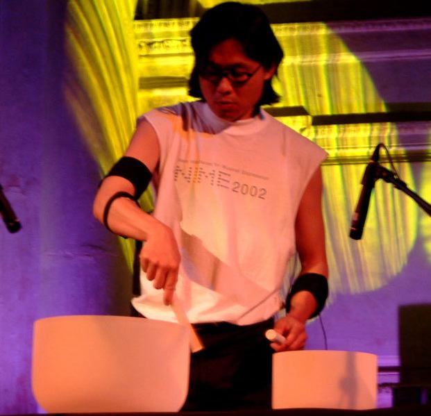 図8は、Sony CSL(Paris)のAtau Tanaka氏がNIME02コンサートで演奏している風景であるが、この鉢状の楽器はチベットの民族楽器そのもので、新インターフェースは本来であればその伝統楽器を演奏(縁を擦ることで発音)するスティックの方である。ここに仕込まれたジャイロセンサにより、演奏の回転角速度情報を検出し、コンピュータ音響生成システムのパラメータとして、筋電センサと共に音楽表現を拡大した。