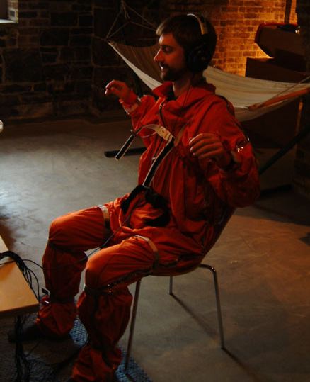 図9は、各種のセンサを仕込んだスーツ(衣服)型のセンシングシステム "Vibrotactile Suit" のデモンストレーションの模様である。楽器というインターフェースを持って操作するだけでなく、身体動作そのものを検出して「楽器」としてしまう、という発想である。