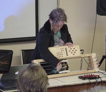 "Report Session I"の2件目は、ベルリン工科大の学生Marije A.J. Baalmanによる "The STRIMIDILATOR, a String Controlled MIDI-Instrument" の発表である。彼女が木製のケースで持参した新楽器(図12)は、4本の弦の振動状態をセンシングするものである。