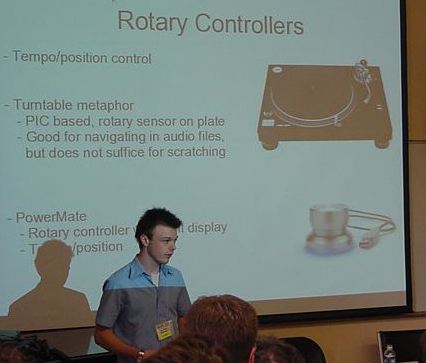 "Report Session I"の4件目、Tue Haste Andersenによる "Mixxx: Towards Novel DJ Interface" は、DJのためのミキサーというインターフェースについての研究であった(図13)。ICMCなど従来の研究では、対象として現代音楽のような難解なものが中心であったが、NIMEではその若さから、「DJやVJ」「テクノ」「ダンス」等のジャンルも積極的に扱っているようである。MIDIベースのセンサ部分は既製品にお任せ、出力部分の音響信号処理もサンプルプレイバック中心ということでやや物足りない印象はあったが、大学院生の自分の好きなテーマでの研究、という迫力は伝わってきた。