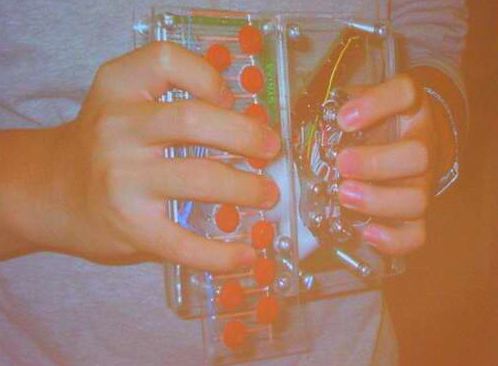 図3は、フランス国立研究機関IRCAMで活動する作曲家から依頼されて製作したコントローラで、両腕に時計のようにベルトで取り付けて、ライブ音楽パフォーマンスの際に多様 なコンピュータ制御を容易に実現するマシンである[17]。