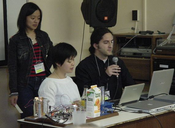 "Report Session III"の2件目は、Hiroko Shiraiwa, Rodrigo Segnini, Vivian Wooによる "Sound Kitchen: Designing a Chemically Controlled Musical Performance" の発表であった。これは文字通り、キッチンで音楽を作ろうというものである。オレンジの果汁とか化学電池の化学反応からの各種情報をセンサで拾って、そのまま音響合成パラメータとして利用して音楽を「化学反応と同時進行」のライブで生成(ステージにはエプロンを着て登場)しよう、というアイデアには脱帽である。スタンフォードCCRMAでMax Mathews先生のゼミで一緒になった3人が共同で研究した「課題」だそうで、3人のうち2人が女性という学生チームが生き生きと研究発表する姿は小気味良いものであった(図18)。