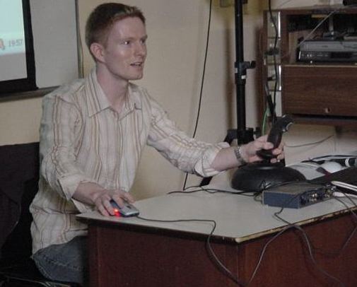 5/23午後の後半"Report Session IV"の1件目は、David M Howard, Stuart Rimell, Andy D Huntによる "Force Feedback Gesture Controlled Physical Modelling Synthesis" の発表であった。フォースフィードバックの付いたジョイスティックで物理モデル音源による音響合成を制御する、というのはもはや古典的であるが、1次元の弦モデル、2次元のメッシュ面モデル、さらに3次元のメッシュ立体モデルなどを3次元空間内で自由に結合した系の全体を自由に制御してサウンドにする、というデモには圧倒された。(図19)。
