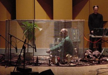 2夜にわたるコンサート初日の1曲目は、Andrew Brouse氏の作品"Conversation"で、ノイズシールドのための金網の籠の中には、脳波センサを付けた作曲家自身と、センサ電極を挿した鉢植えの植物が対峙していて、その「対話」ライブセンシング情報で音楽音響を生成する、というものであった。これが本当に対話だったのかどうかは、本人と植物自身しか判らない世界である(図20)。
