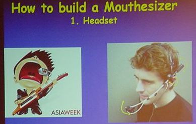 "Paper Session III"の2件目、Michael J. Lyons, Michael Haehnel, Nobuji Tetsutaniによる "Designing, Playing, and Performing with a Vision-based Mouth Interface" の発表であった。これはとことん「口のコントロール」にこだわったセンサで、CCDカメラで人間の口元を撮影して画像認識から「口の開け方」を検出するというものである(図24)。