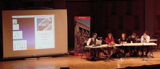 コーヒーブレークのあとの午前中最後のセッションとして「NIME04」があった。筆者はNIME04のOrganizerということでステージの上に並ぶことになり、前夜にホテルで作った資料を提示して、「世界に誇る楽器の街、浜松でのNIME04にどうぞおいで下さい」とアピールした(図26)。