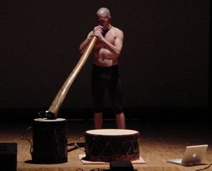 2曲目は、John Young氏の作品"Ars Algorymica"で、アボリジニの民族音楽をベースにした作品である。鍛えた身体での循環奏法による民族楽器の熱演は好評であった(図28)。