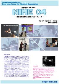 なおNIME04の基調講演には、世界的に有名な「ムーグシンセサイザー」の生みの親である、R.Moog博士、そして世界を舞台に活躍するメディアアーティストの岩井俊雄氏をともに招聘する予定である。また、関連イベントとして、ヤマハ、ローランド、カワイなどの工場・研究所バスツアー(海外研究者中心、業界関係者以外)、DJ/VJライブなどの企画も検討中である(全て本稿執筆時点 : 2003年10月現在)。
