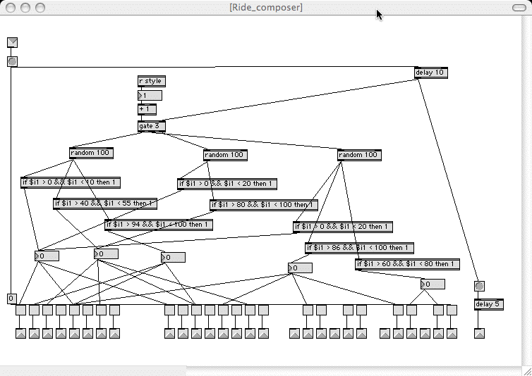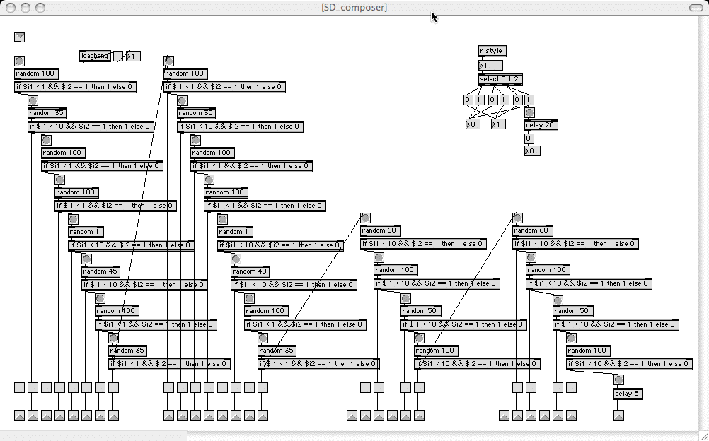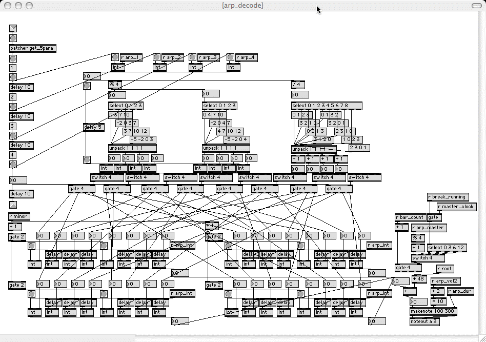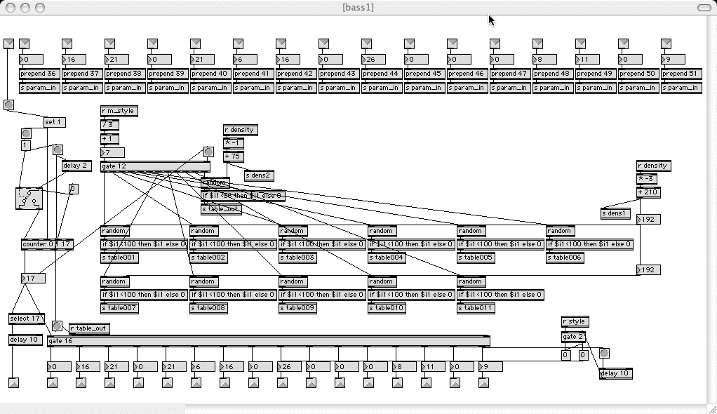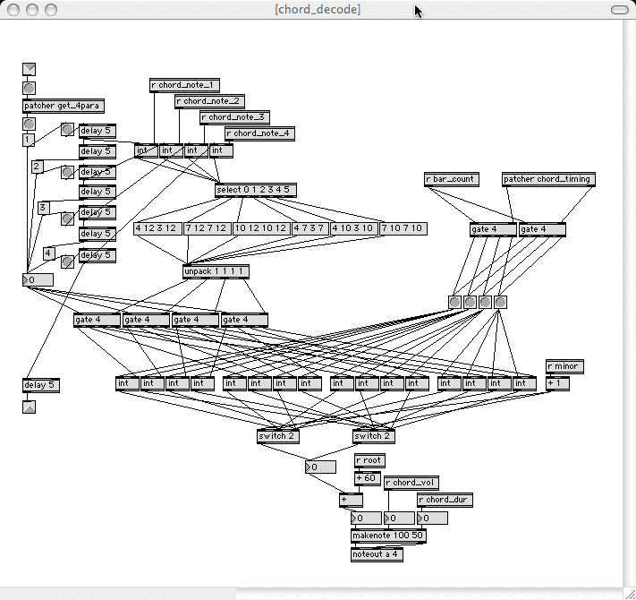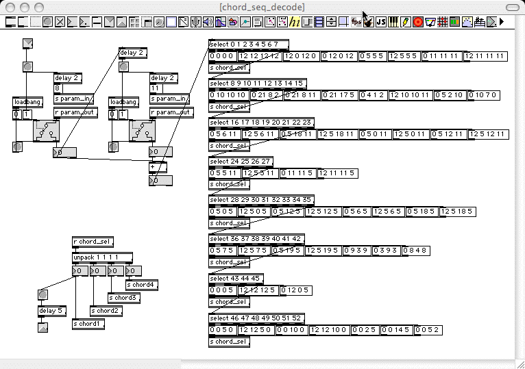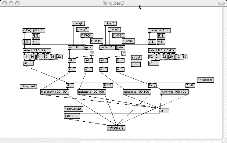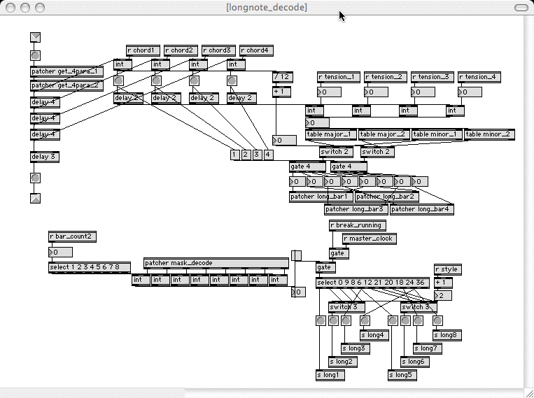 FMC3の開発の最後に(おまけ的に)付加したのが、 小節ごとに2音のロングトーンを一種の「疑似メロディー」のように演奏するパートです。 一言で言えば、「コード(min7thコードまたはドミナント7thコード)を構成する4音に加えて、 UST(上部構成3和音)として許容されるテンションノートを候補に追加する」というアルゴリズムです。 下図はその生成ブロックとサプパッチの一つです。