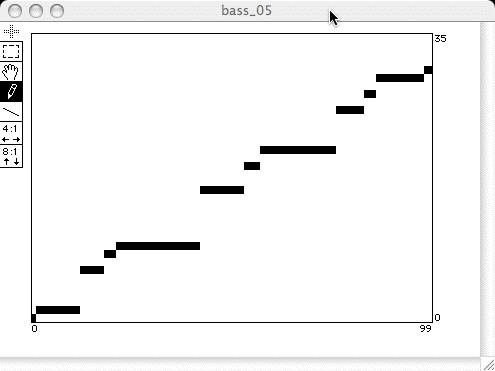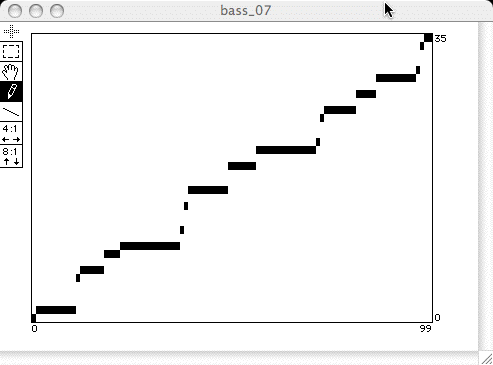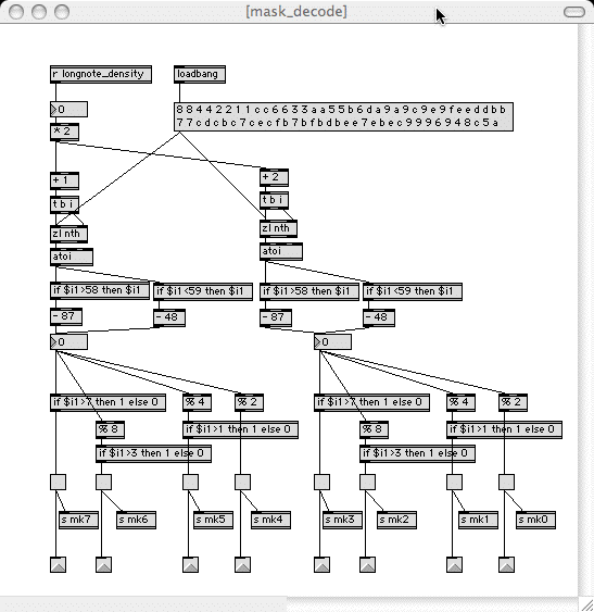 以上のルールを単純に摘要すると、「全ての小節で必ずロングノートが鳴り続ける」という不自然な音楽に聞こえます。 そこでFMC3では、パラメータ(m=30)として「LongNote Density」を定義しています。 これは、ロングノート・疑似メロディーパートを、 8小節を単位として「それぞれの小節で演奏するかしないか」という36種類の組み合わせパターン