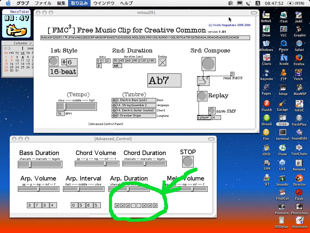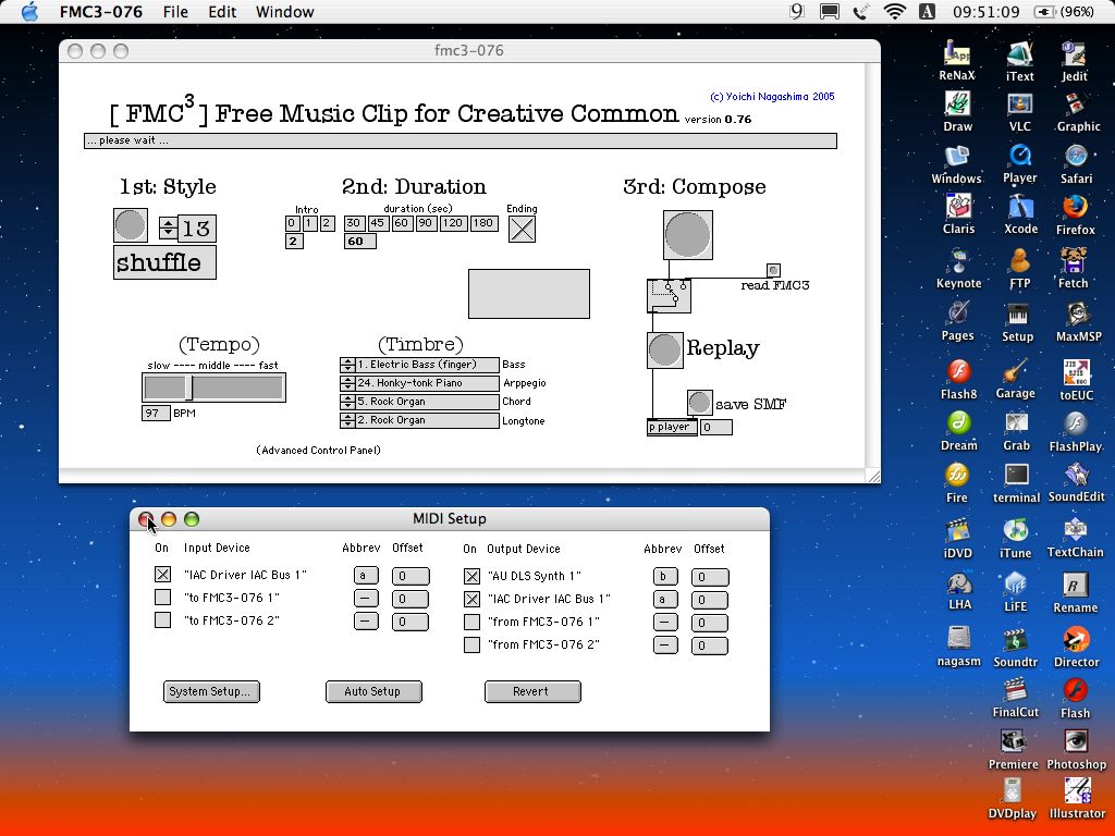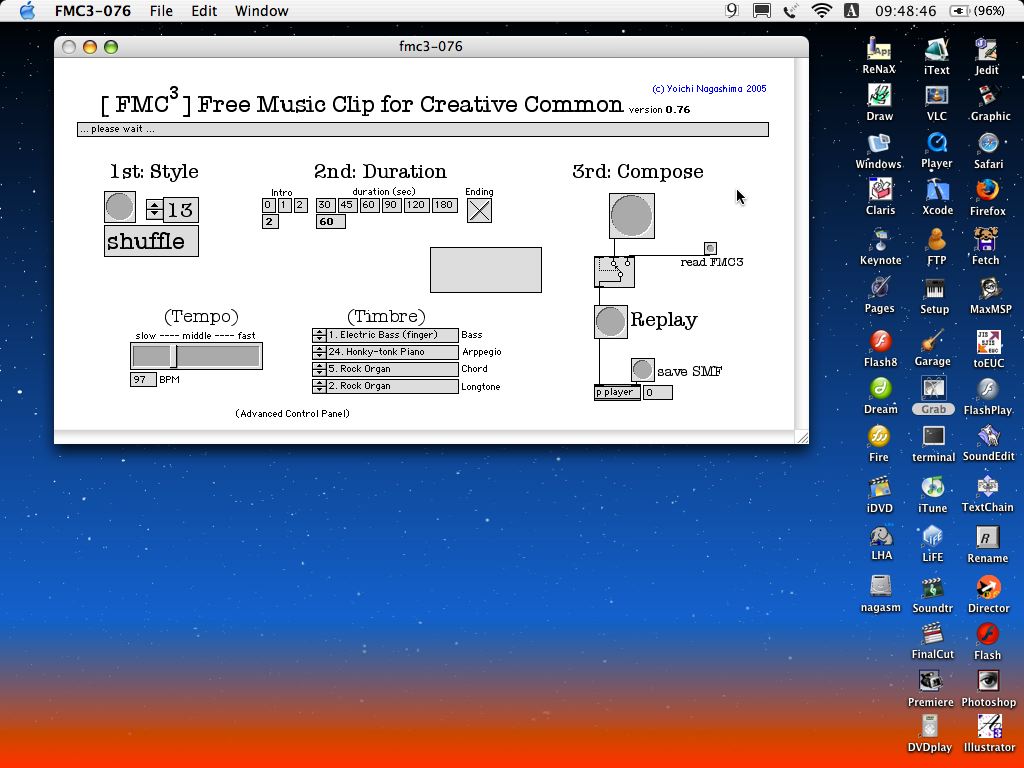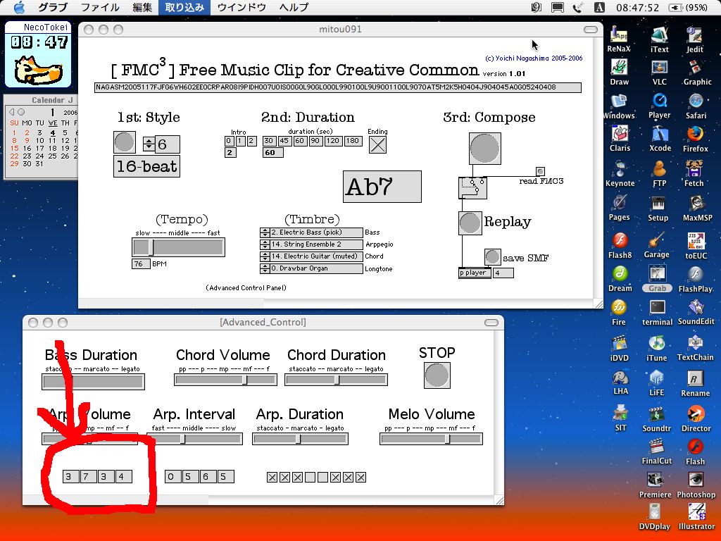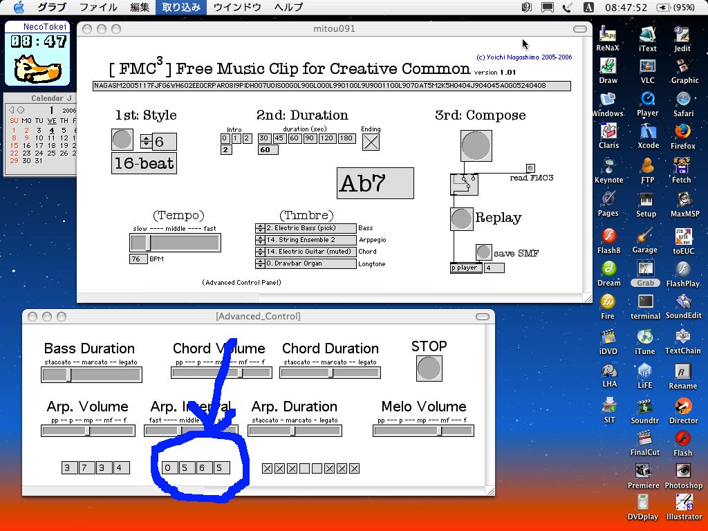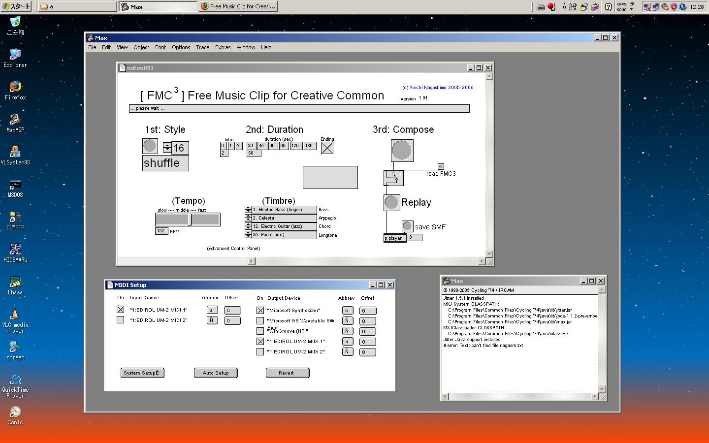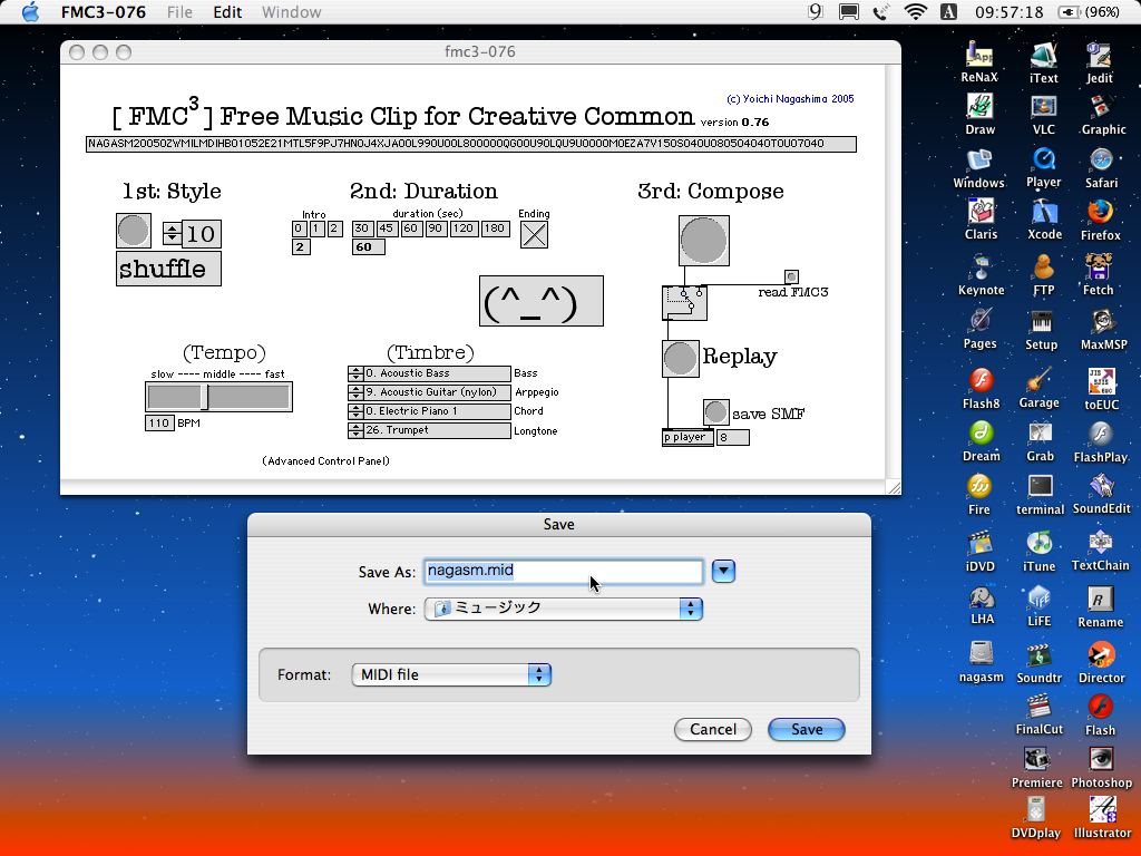 サンプルから選ぶより、生成プログラムをダウンロード/インストールして、 自分の手元でどんどんオリジナルのFMC3を作ってみたい、という人は (2)「自分の手元でFMC3を生成する」へどうぞ。 このフリーソフトはMacintosh(OSX)版と、WindowsXP版(ただし若干の外付け装置が必要)とがあります。