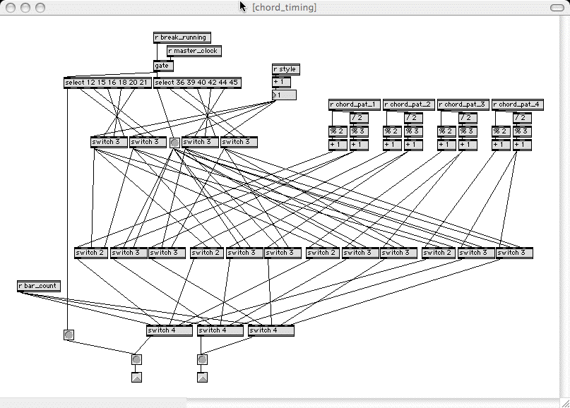 コード進行(各小節ごとのコードネーム情報)に対応してFMC3で生成する音楽情報として、 メインであるドラムとベースに加えて、 控え目な音量で「コード(和音)を短くカッティング演奏するパート」による伴奏も付加しました。 ただし基本方針として「和音の構成音を全て同時に鳴らす」というようなダサい演奏は避けたいので、 コード(コードネームとしてはドミナント7thコードとマイナー7thコードの2種)を構成する4音のうち、 重要な2音だけを同時に、「各小節の2拍目(必ず演奏)」と「4拍目(無し/演奏)」に2音フレーズとして短く鳴らす、 という仕様としました。 下図はその生成ブロックと、タイミング生成のサプパッチです。