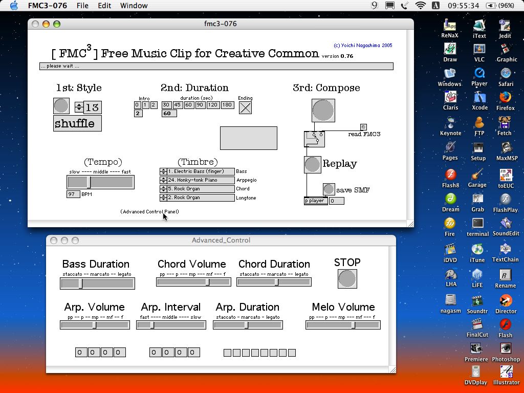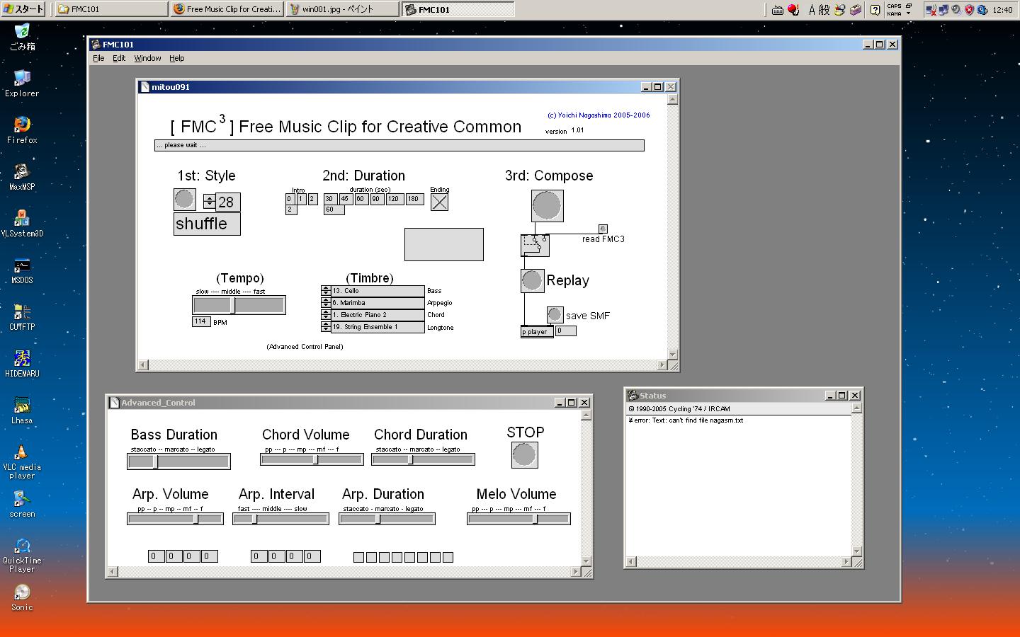 IPA 未踏ソフトウェア創造事業 (竹林PM) に採択・助成され、多数のフリー音楽クリップを生成するシステムを開発する機会を得ました。 これに感謝し、未踏プロジェクト採択テーマの目的でもあるコンテンツデザインの普及のため、 FMC3生成プログラムをソースごとフリー公開するとともに、 サンプル集(FMC3、および活用したFLASH作品集)を公開いたします。