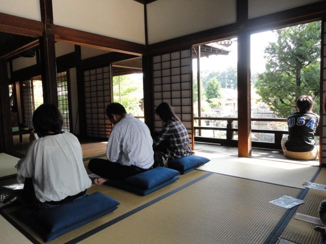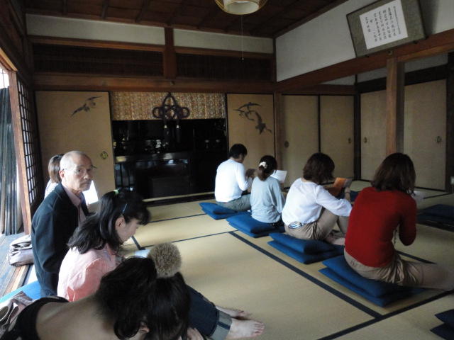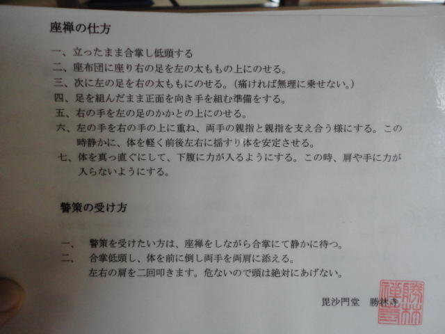 生まれて初めての座禅体験でした。 修行僧の厳しいものではなくて、希望する人は合図に合掌して警策を打ってもらう・・・という素人向けのものでしたが、 実際に警策を打ってもらうと、身体の無駄な力が抜けて心地よかったです。
