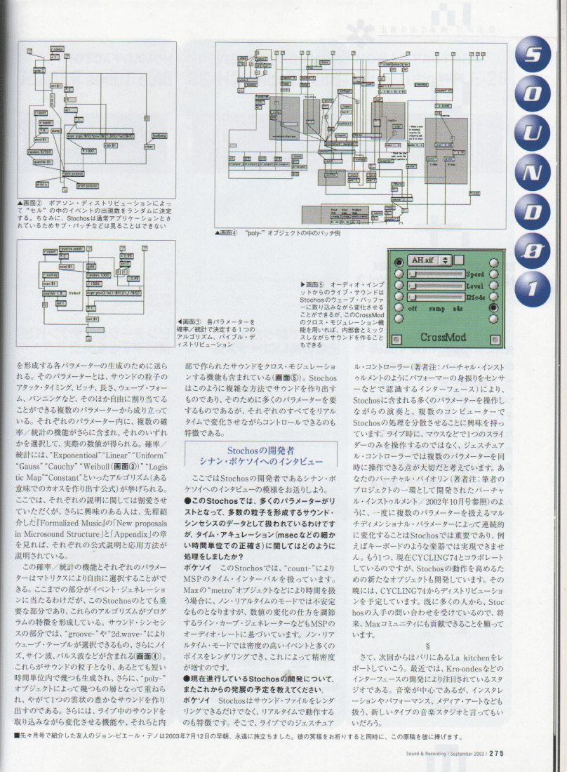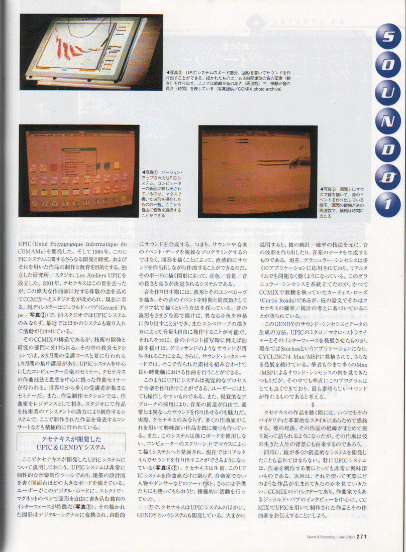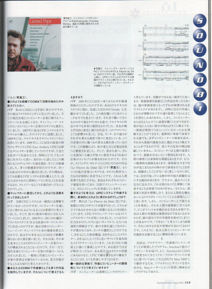 NIME04に合わせて来日予定の、パリのスタジオ CCMIXのディレクタGerard Pape氏から、 作曲家の後藤英さん(IRCAM)をメンバーに含む以下のような企画を提案いただいています。 内容、条件などは柔軟に相談に応じるそうです。 後藤英さんには、NIME04の翌日、6/6にSUACでのMAF2004公開レクチャーコンサートに 出演いただく予定ですので、それ以外、「6/2以前」「6/7以降」の日程で、 このような企画を呼んでみたい、というような、大学・機関・ホール・ギャラリー・研究所・企業などがありましたら、 紹介いたします。 こちらまでメイルで御連絡下さい。日本語での関連情報(記事) その1 その2 その3 その4 その5 その6