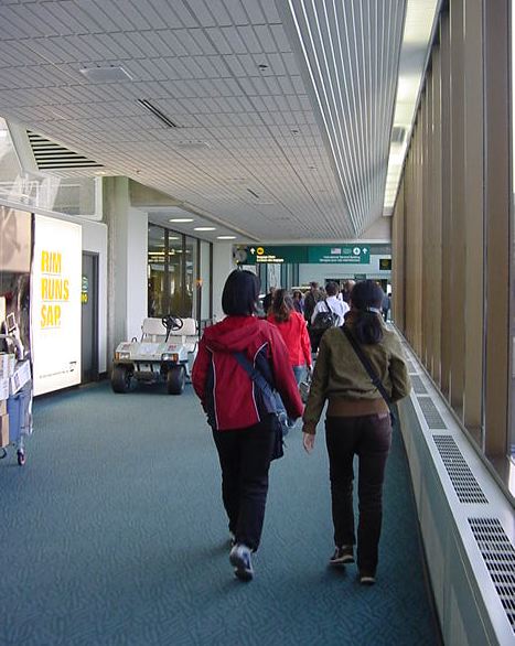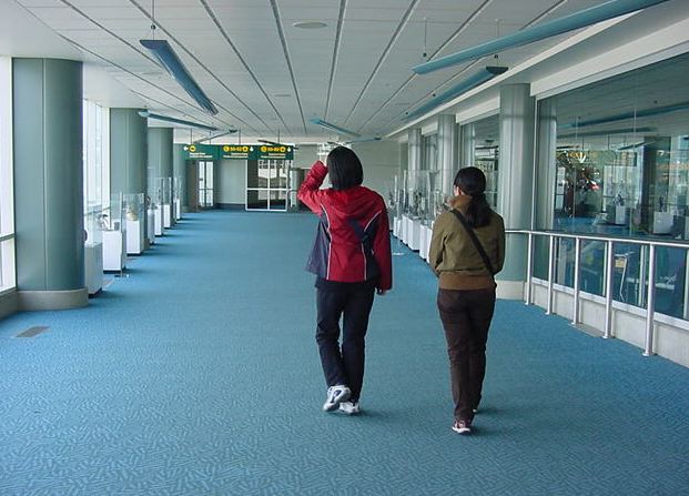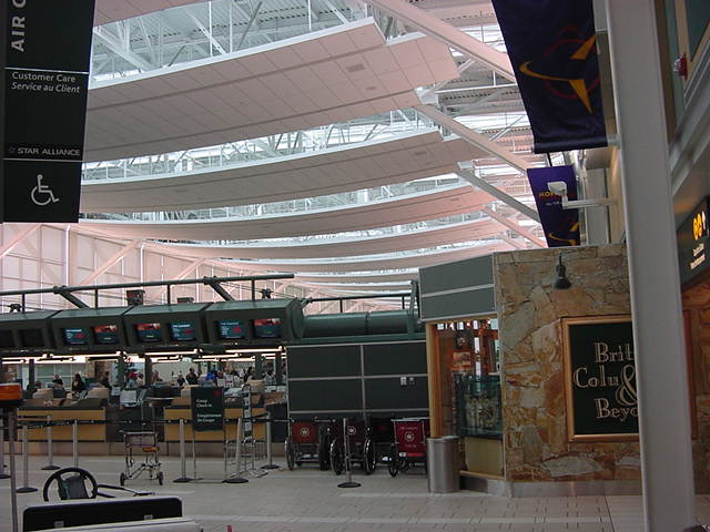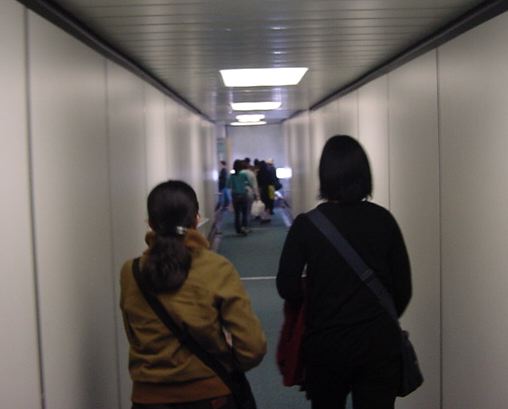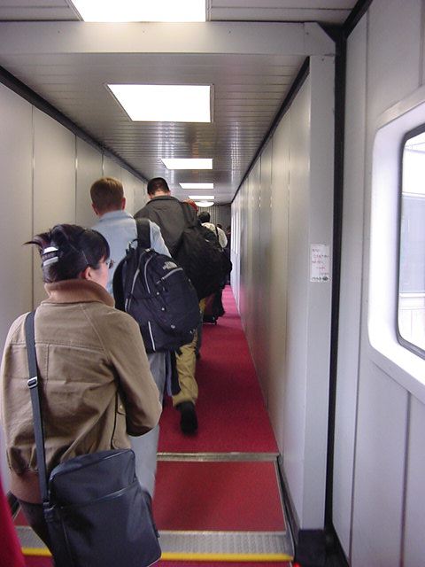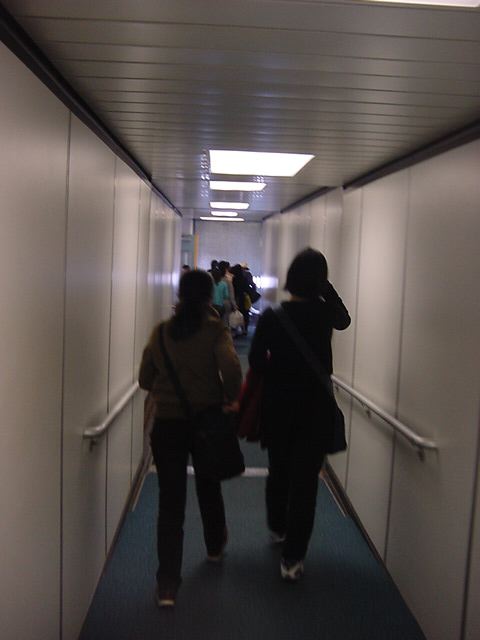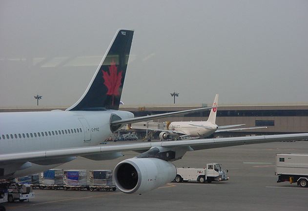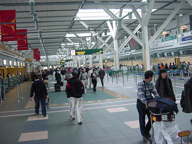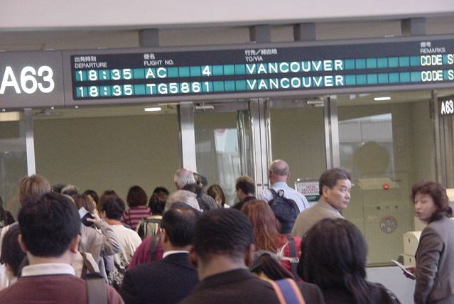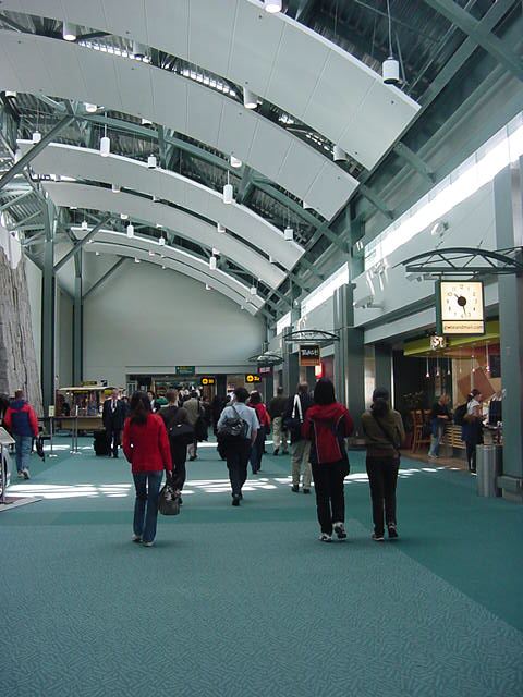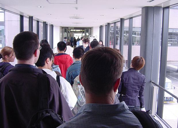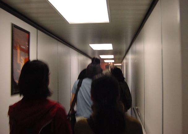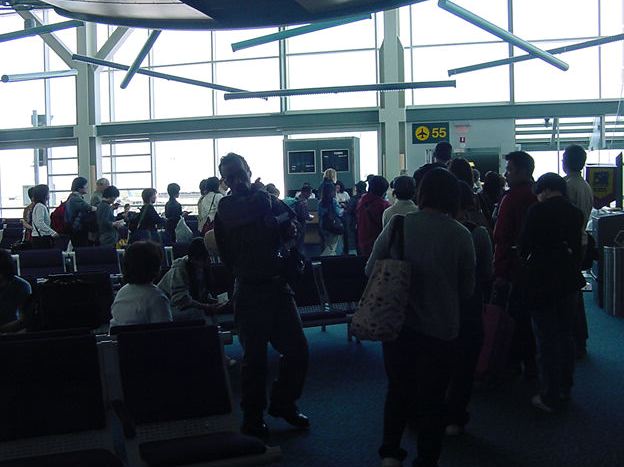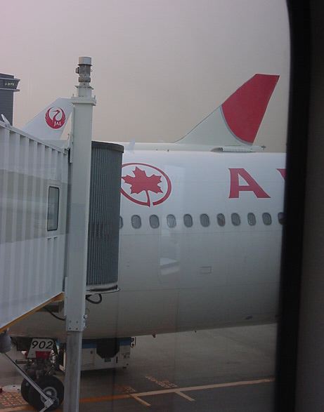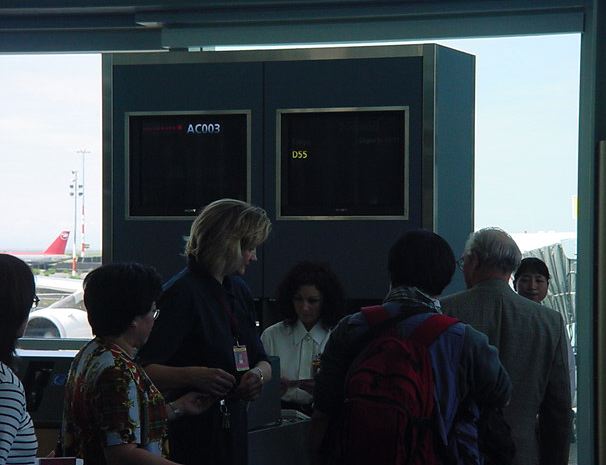 当初はトロント経由でモントリオールのチケットを買ったのですが、トロントがWHOからSARSの指定を受けると、エアカナダは2日後には日本からトロントへのフライトを速攻で抹消しました。 その後、いったんWHO解除されてもフライトは10月まで復活せず、つまりリストラの格好の口実になった模様です。 それでバンクーバー経由に変更となって、空港でだいぶ待つことになり、僕はメイルをチェックしている間に、学生2人は散歩して写真を撮りました。 午後4時の繁忙期なのにこれだけ閑散とした成田空港は驚異的です。 ★ ★ ★ ★ ★ ★