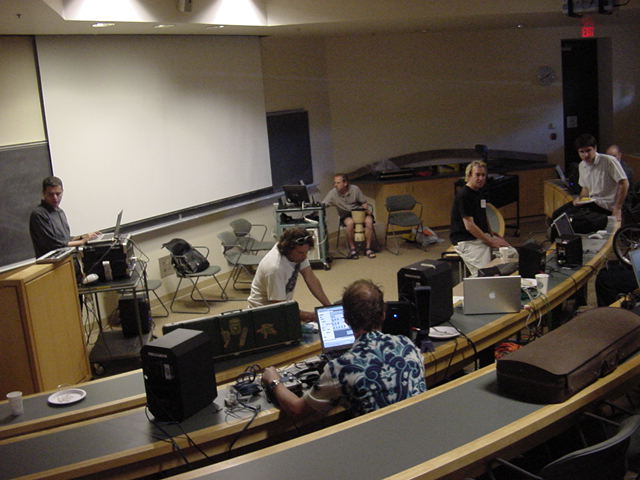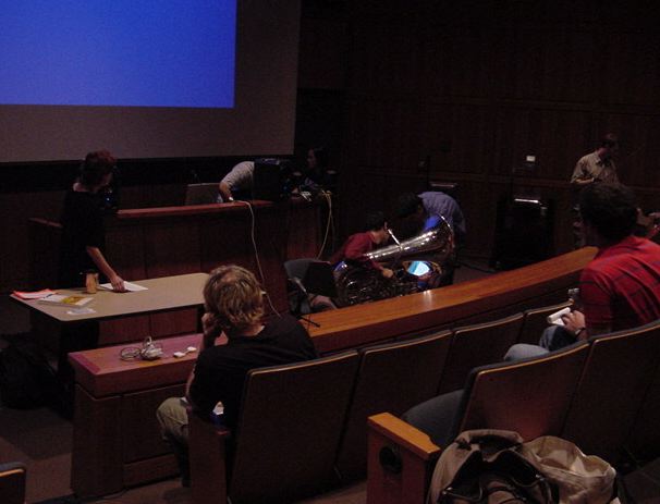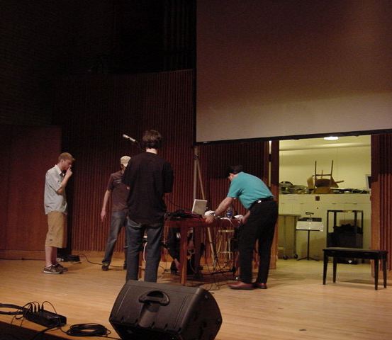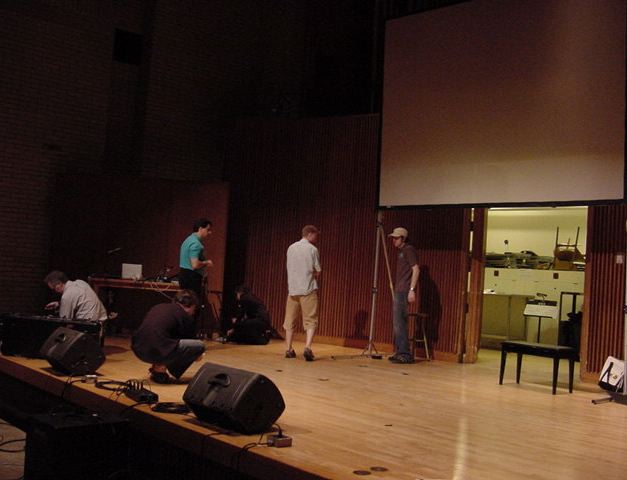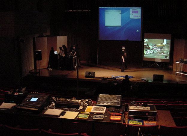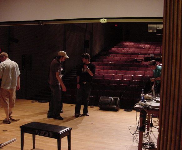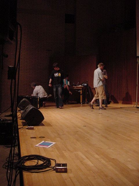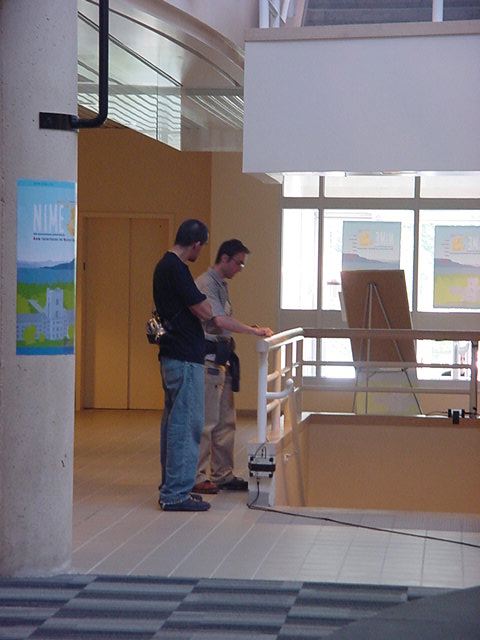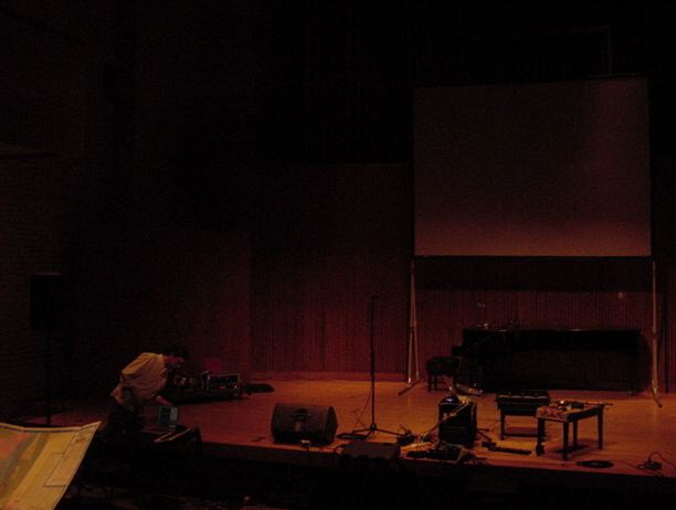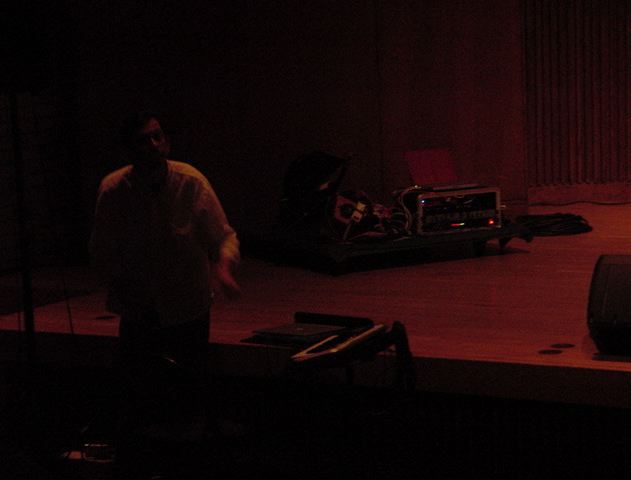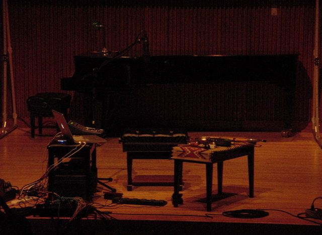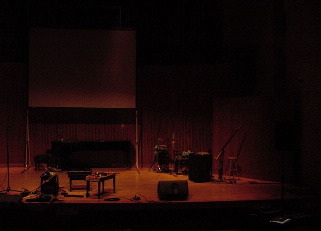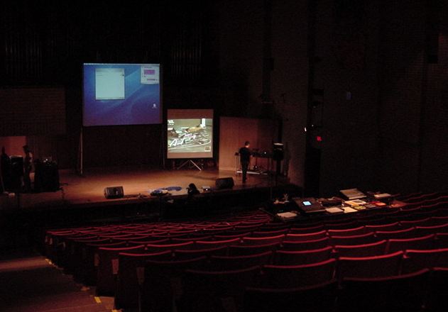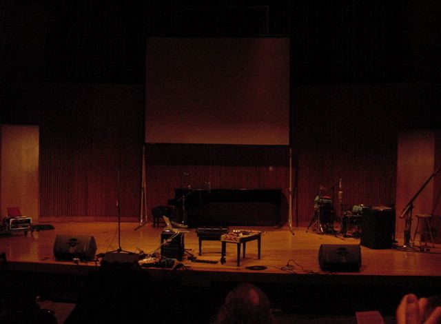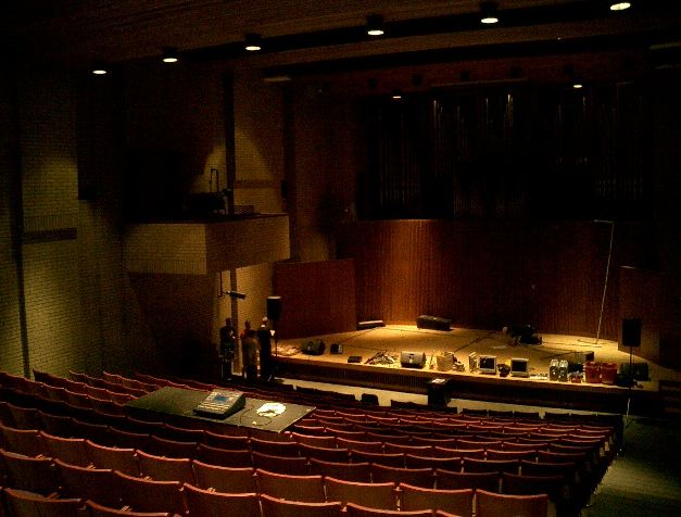 この日は晩のコンサートで本番の公演があり、リハーサルが11:30-12:30に予定されていました。 そこで午前のセッションはパスしてホールに向かい、まずはバックヤードでセッティングをして、 朝イチのリハーサルをたった一人、客席で楽しみました。 ビデオを撮ったので、写真は少しだけです。 ★ ★ ★ ★ ★ ★ ★ ★ ★いよいよ自分のリハです。 NIME03 のコンサートの時には、学生が2人、付き人として手伝ってくれたのですが、 今回は一人だけだったので、リハ中の記録はありません。 持参したSC-55mkIIのライン出力の片方が死んでしまっていたので、 Max/MSPの出力とミックスした全てをヘッドホン端子からPAに出す、 という苦渋の選択となりました。 ★ ★ ★ ★ ★ ★ ★ ★ ★ ★ ★ ★ ★ ★ ★ ★