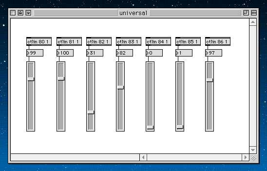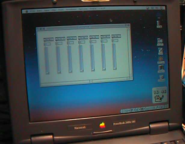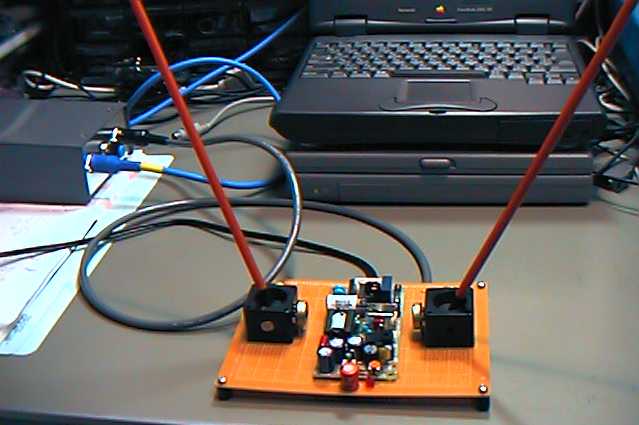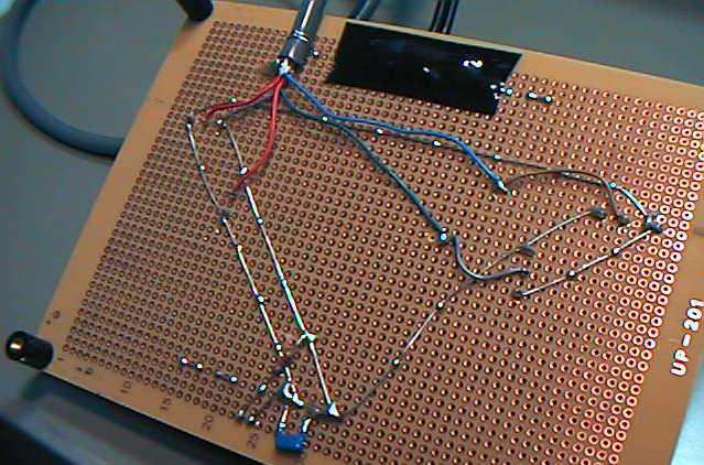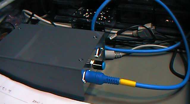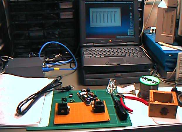 これ は、ここでは製作するアナログボードのチェッカとして機能する、 すでに完成した汎用A/D-MIDIボックスです。これは、ここの連載を 読めば、誰でも作れるものの筈です。手前のMIDI出力はすでに Mac(MAX)のMIDI入力に接続されているので、向こう側の 汎用アナログ入力コネクタにつなぐものを作る、というわけです。
