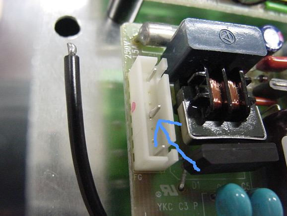 ハンダ付けをする相手(ここでは矢印のスイッチング電源のコネクタ)も