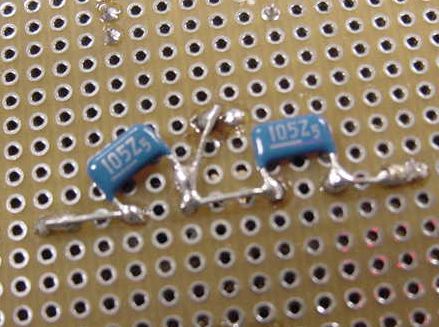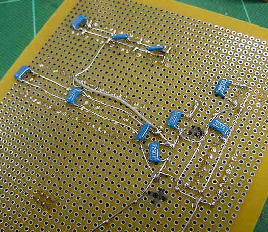 基板裏面で、スズメッキ線を駆使して、両方の電源ラインとGNDと