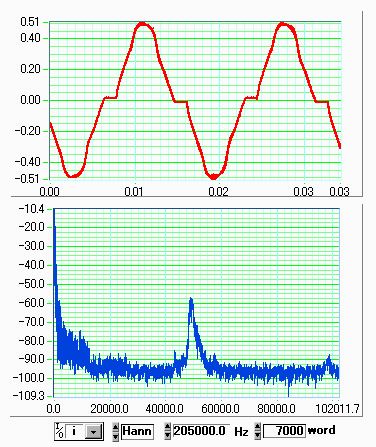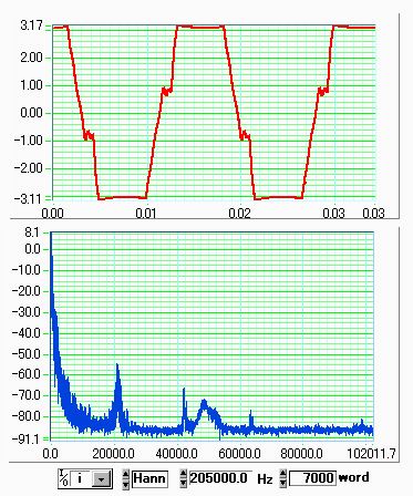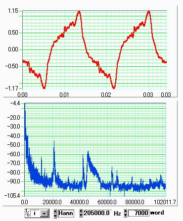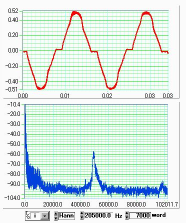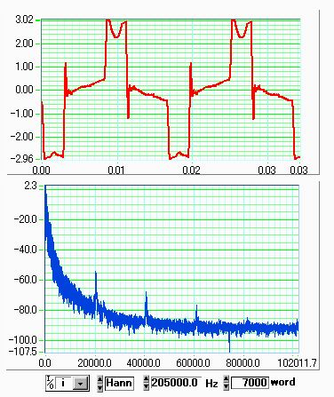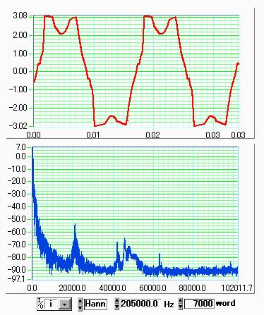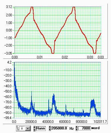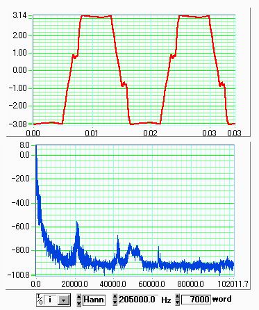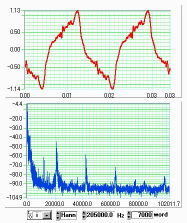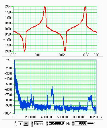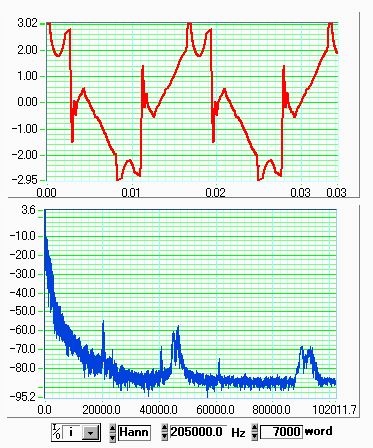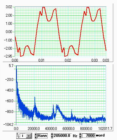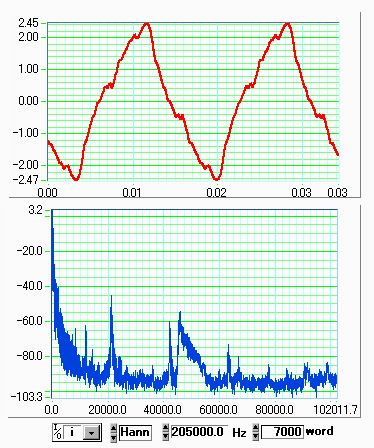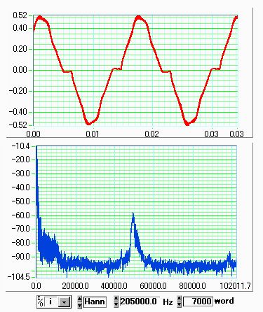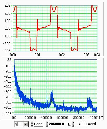 状態です。電源波形は上とほとんど同じ状態ですが、電流スペクトルを