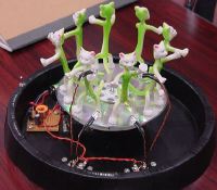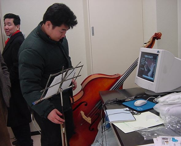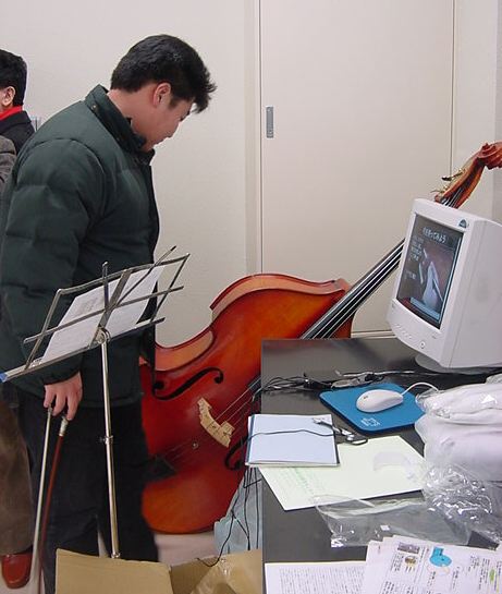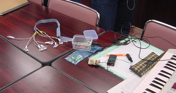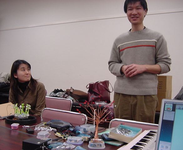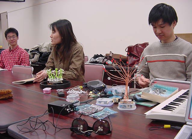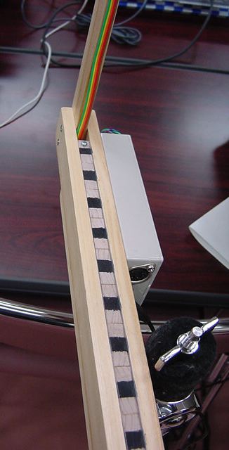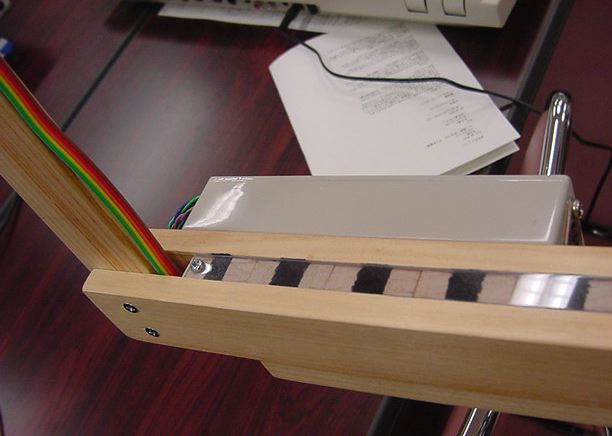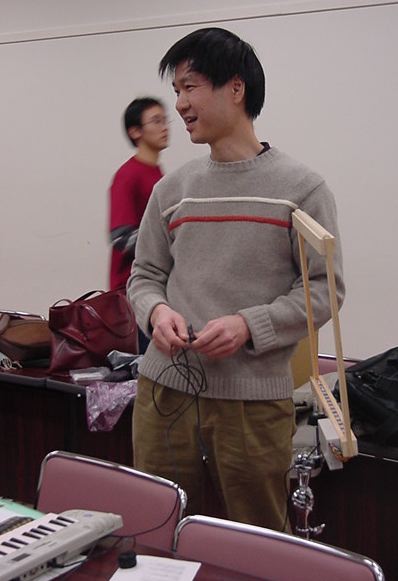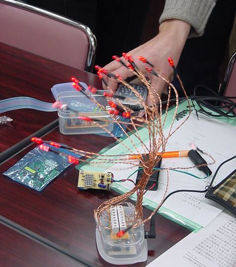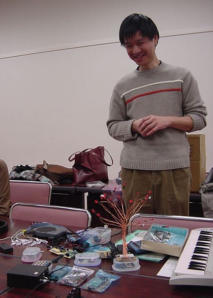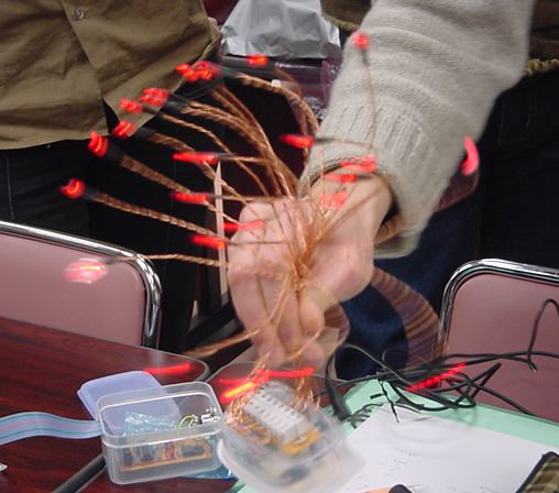 そしていよいよ、星合さんワールドのスタートです。まずは、長嶋作品「光の弦」を 意識してローコスト版としてPICで開発した「光の絃」です。 4ブロックごとにLEDを時分割点灯させ、PICがシリアルポートでなく 1ビットのラインを直接に上げ下げしてMIDIを出す、というところに こだわりがあります。またデフォルトで、弾かれたノートだけでなく 通奏低音のようなサウンドも付加することで、これだけでなかなか 「弾けて」しまう、という作品です(^_^)。 ★ ★ ★ ★ ★ ★ ★ ★ ★ ★ ★ ★ ★ ★ ★