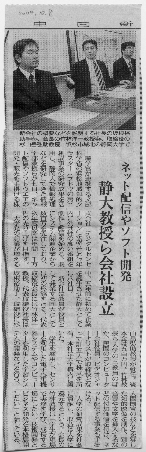 静大ベンチャー企業静岡大情報学部(浜松市城北)の竹林洋一教授らによるIT(情報技術)のベンチャー企業「デジタルセンセーション」が7日、学内に発足した。静大では工・情報学部などを中心とした起業が6例あるが、複数の専任教員が役員を兼業するのは初めて。