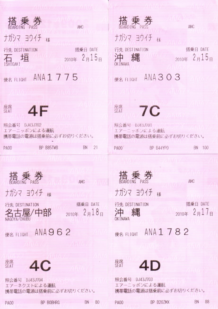 2010年2月15日いつものように便利なセントレアまで浜松からバス2時間、そしてセントレアから那覇までのフライトが2時間半。 休暇なのでこの機内から早くもワインをいただきました(^_^;)。そして那覇空港で石垣行きに乗り継ぎのために待っていると、「那覇から静岡空港へのフライトは、現地が濃霧のため、中部か羽田に行き先が変更になってもゴメンナサイ」とのアナウンス。あの茶畑の中に空港を作るというのは、茶畑に適した霧を最初から無視しているので当然、こりゃ頻繁に起きているんだろうなぁ・・・と静岡空港の利用者が気の毒になりました。 1時間ほどのフライトで石垣空港へ。滑走路が短いのでいつもの急ブレーキでした。今回の写真はここからスタートです。 ★ ★ ★ 石垣離島航路ターミナル近くの宿に荷物を置いて、徒歩数分の「あやぱにモール」にお土産を下見に行きました。 ★ ★ ★