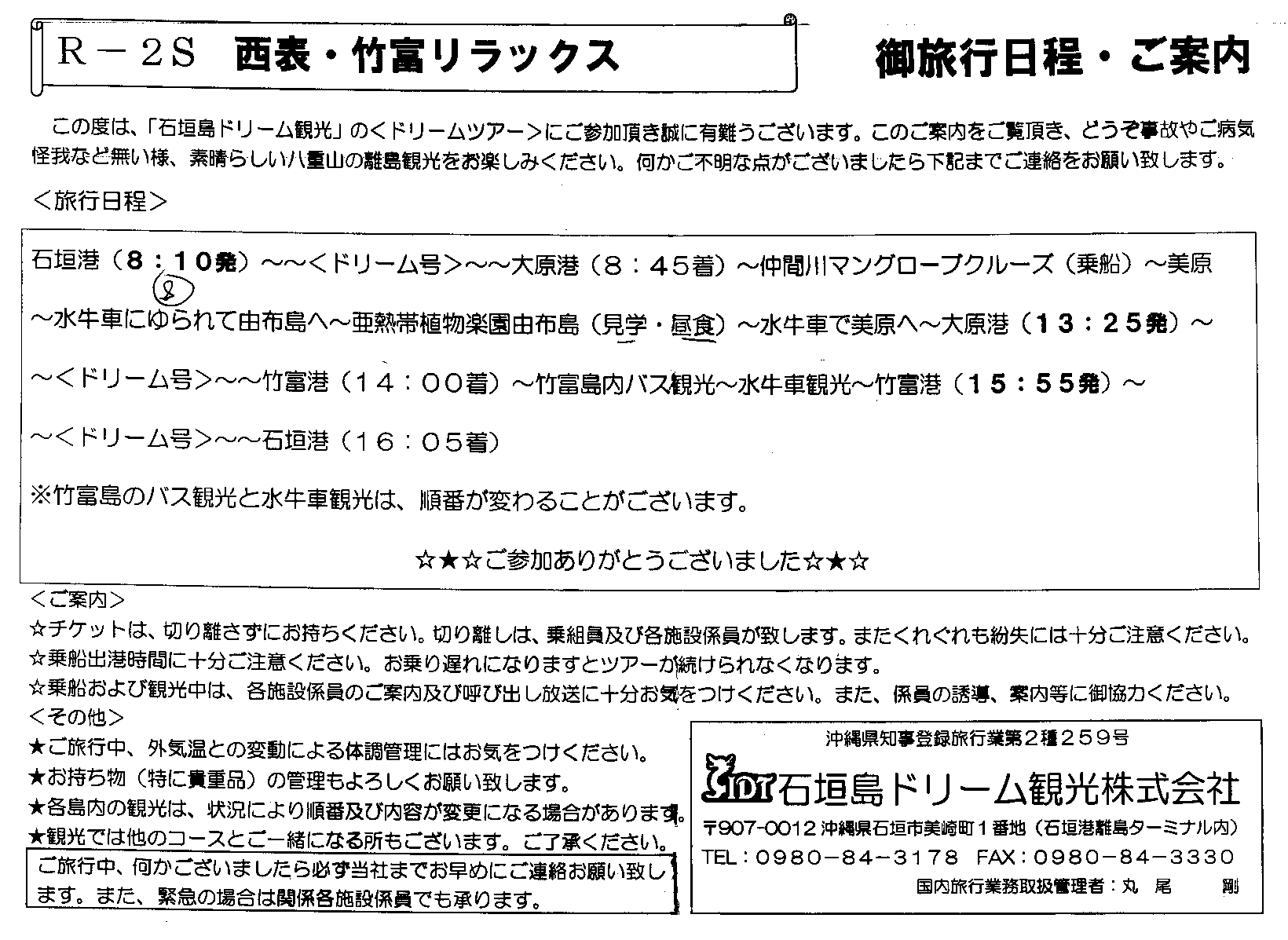 2010年2月16日今回の石垣島はずっと曇り、ときどき雨でした。まぁ東京は雪だったようなので文句は言えません。 雨カッパを買い、仲間川のマングローブ林のツアーボートに乗りました。 写真のコントラストが明るく飛び気味なのは、実は曇りで写真よりも相当に薄暗いためです。 カメラは自動補正で明るくしてくれてますが、画像は粗くなりました。 ★ ★ ★ ★ ★ ★ ★ ★ ★ ★ ★ ★ ★ ★ ★ ★ ★ ★ ★ ★ ★ ★ ★ ★ ★ ★ ★ ★ ★ ★ ★ ★ ★ ★ ★ ★ ★ ★ ★ ★ ★ ★ ★ 仲間川ボートクルーズの後は、観光バスで20分ほど移動。 ★ ★ ★ ★ 西表島に浅瀬を隔てて隣接する由布島が、今回のツアーの目玉です。 水牛車でのんびりと渡ります。 ★ ★ ★ ★ ★ ★ ★ ★ ★ ★ ★ ★ ★ ★ ★ ★ ★ ★ ★ ★ ★ ★ ★ ★ ★ ★ ★ ★ ★ ★ ★ 由布島は、住民がいなくて島全体が観光園となっています。 ここで我々のツアーは昼食を挟んで、ちょっと長めの自由時間でした。 ★ ★ ★ ★ ★ ★ ★ ★ ★ ★ ★ ★ 水牛車の海上を渡る風が肌寒かったので、ちょっと早めに昼食をとりました。 ★ そして園内へ。海辺のカフェでは、昼間っから古酒(クースー)をいただき、1時間近く、ぼーーっと海を眺めました。 ★ ★ ★ ★ ★ ★ ★ ★ ★ ★ ★ ★ ★ ★ ★ ★ ★ ★ ★ ★ ★ ★ ★ ★ ★ ★ ★ そして再び園内へ。あちこち眺めて歩きました。 ★ ★ ★ ★ ★ ★ ★ ★ ★ ★ ★ ★ ★ 由布島から西表島に戻る水牛車では、静止画でなくずっと動画を回しました。 ただし寒いので透明ビニール越しに、水牛のお尻ばっかりの映像ですが、おじさんの話を聞きたい人はどうぞ。(^_^;) バスで大原港に戻り、今度は竹富島まで25分ほど。 ★ ★ ★ ★ ★ ★ ★ ★ ★ ★ 竹富島のツアーでは、まず資料館に行き、そこからマイクロバスとなりました。 ★ ★ ★ ★ ★ ★ ★ そして、「星砂」の発祥の地、竹富島の星砂浜に行きました。 運良く、実際に星砂をゲットできました(^_^)。 ★ ★ ★ ★ ★ ★ ★ ★ ★ ★ ★ ★ ★ ★ ★ ★ 今も昔からの風景の残る集落の中を、水牛車でのんびりと回りました。 人間が歩くと10分ほどの距離ですが、30分ぐらいかけて進みます。 ★ ★ ★ ★ ★ ★ ★ ★ ★ ★ ★ ★ ★ ★ ★ ★ ★ ★ ★ ★ ★ ★ ★ ★ ★ ★ ★ ★ ★ ★ ★ ★ ★ ★ ★ ★ ★ ★ ★ ★ ★ ★ ★ ★ ★ ★ ★ ★ ★ ★ ★ ★ ★ ★ ★ ★ ★ ★ ★ ★ ★ ★ ★ ★ ★ ★ ★ ★ ★ ★ ★ ★ ★ ★ ★ ★ ★ 竹富湊に戻り、石垣島までの船は10分ほどです。 ターミナルからホテルに帰ると17時過ぎでした。 ★ ★ ★ ★ ★ ★ ★ ★ ★ ★ ★ ★ ★ ★ ★