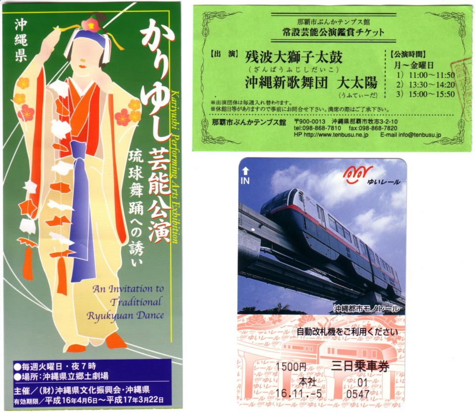 4日間の旅行の後半、3日目の朝になりました。この日は朝から再びりっかりっか温泉に行き、 1時間半ほど、サウナ、ジェットバス、マッサージバス、天然温泉、などを満喫、堪能しました。 部屋に戻ると前日と同じように10時を過ぎて、 去年 のように、座間味島に渡る船にも間に合わず、今回は離島はパスとなりました。 気付いてみると、まだ沖縄まで来たのに ゆいレール と じんじん と りっかりっか湯 だけだったので(^_^;)、この日は「琉球芸能体験その他」の日としました。