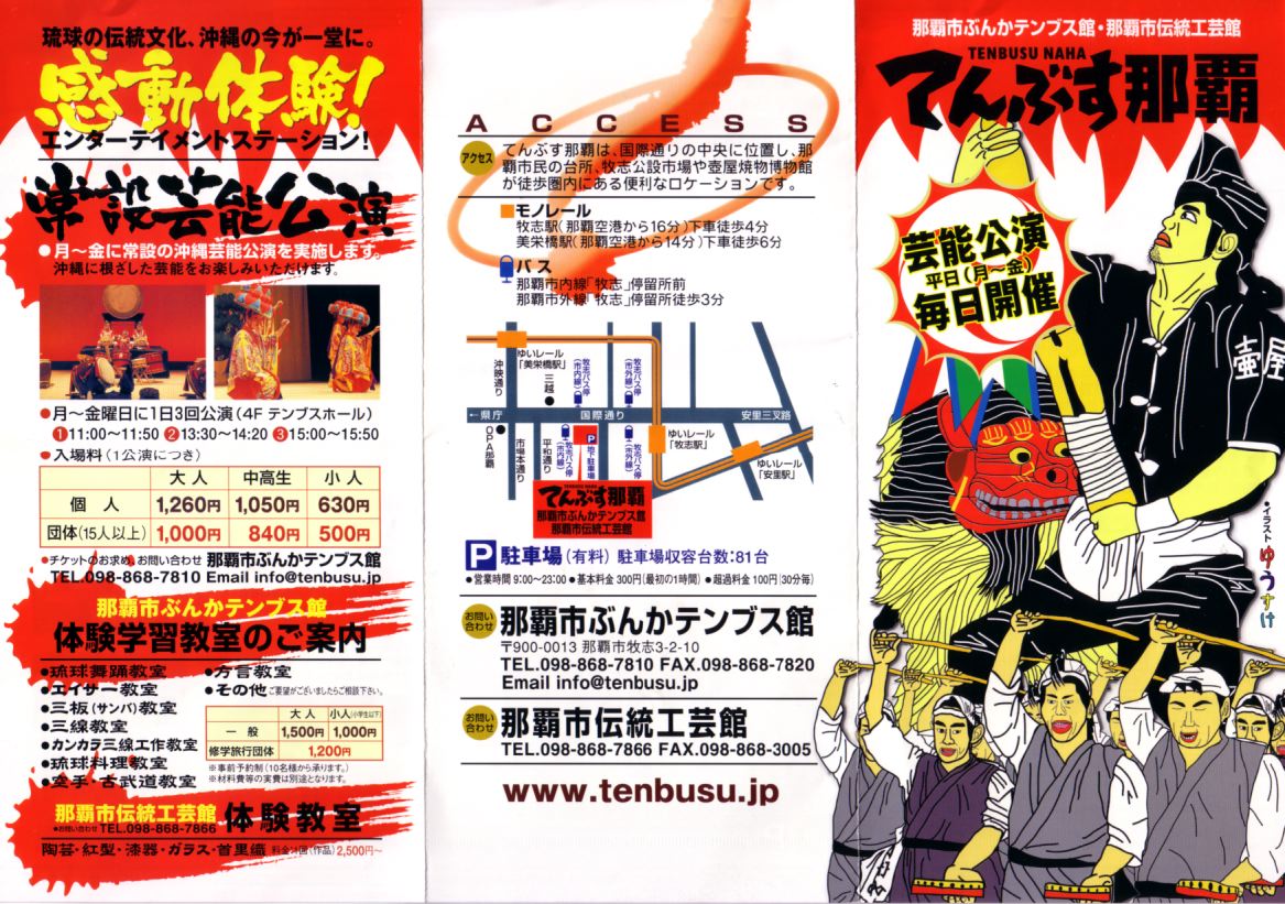 最初に行ったのは、国際通りに新しくできた「てんぶす那覇」 ★ ★ という施設で、ここの4階ホールで常設芸能公演として毎日3回行われているものの、 11時からの部を観ることにしました。この日は 大太陽 というところの公演です。