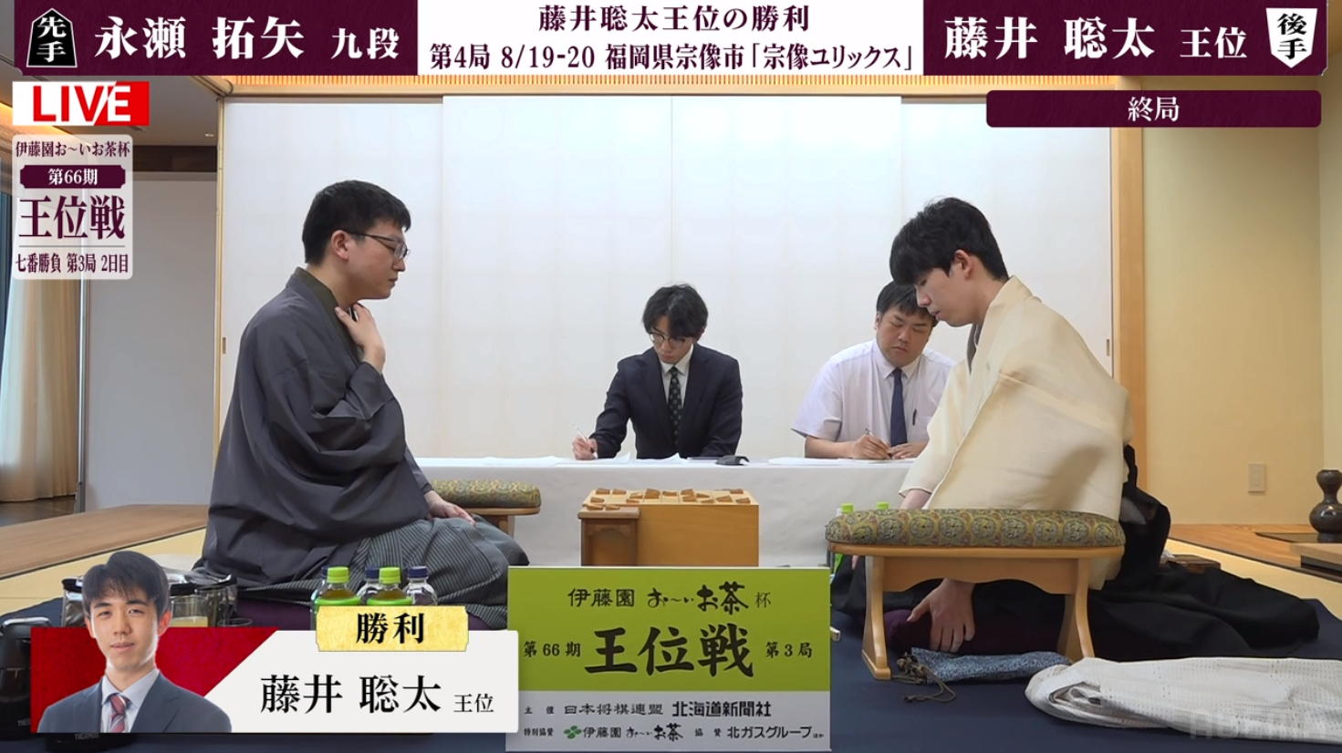 そして対局開始となった。 先手永瀬、後手藤井、戦型は角換わりということで、どうせこの二人だとこの午前中は遅々として放送事故のような画面になる・・・と思っていたら、サクサクサクサクどんどん進んで、たった1時間で47手になってしまった。 これで2日間、指し続けられるのだろうか。