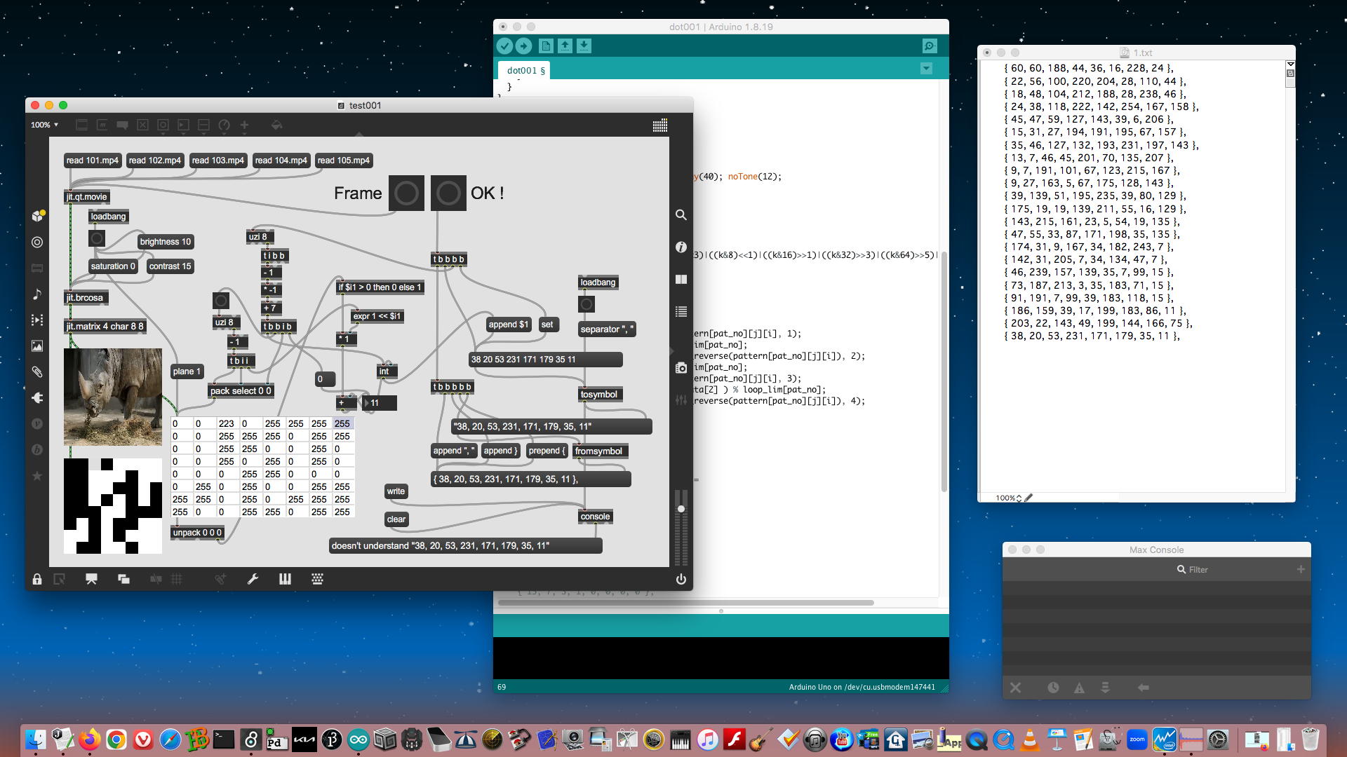 そして午前中には、「ドットマトリクスLED搭載オムニホイールロボット」を、とりあえず(1)待機中は12パターンからランダムに8stepsアニメーション(2ドット表示)、(2)動作中はその4倍の速さで1ドットをランダム表示、という仕様で上のようにfixして、 YouTube動画 にも上げてみた。