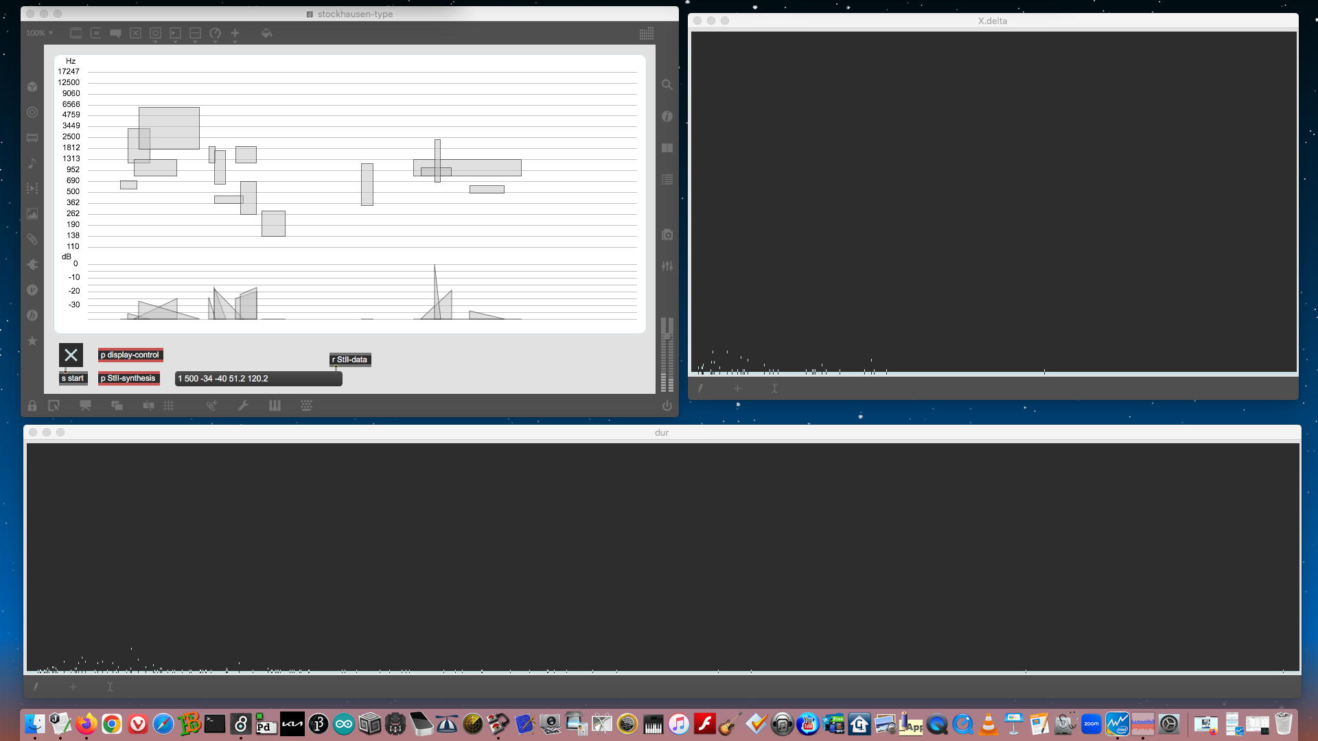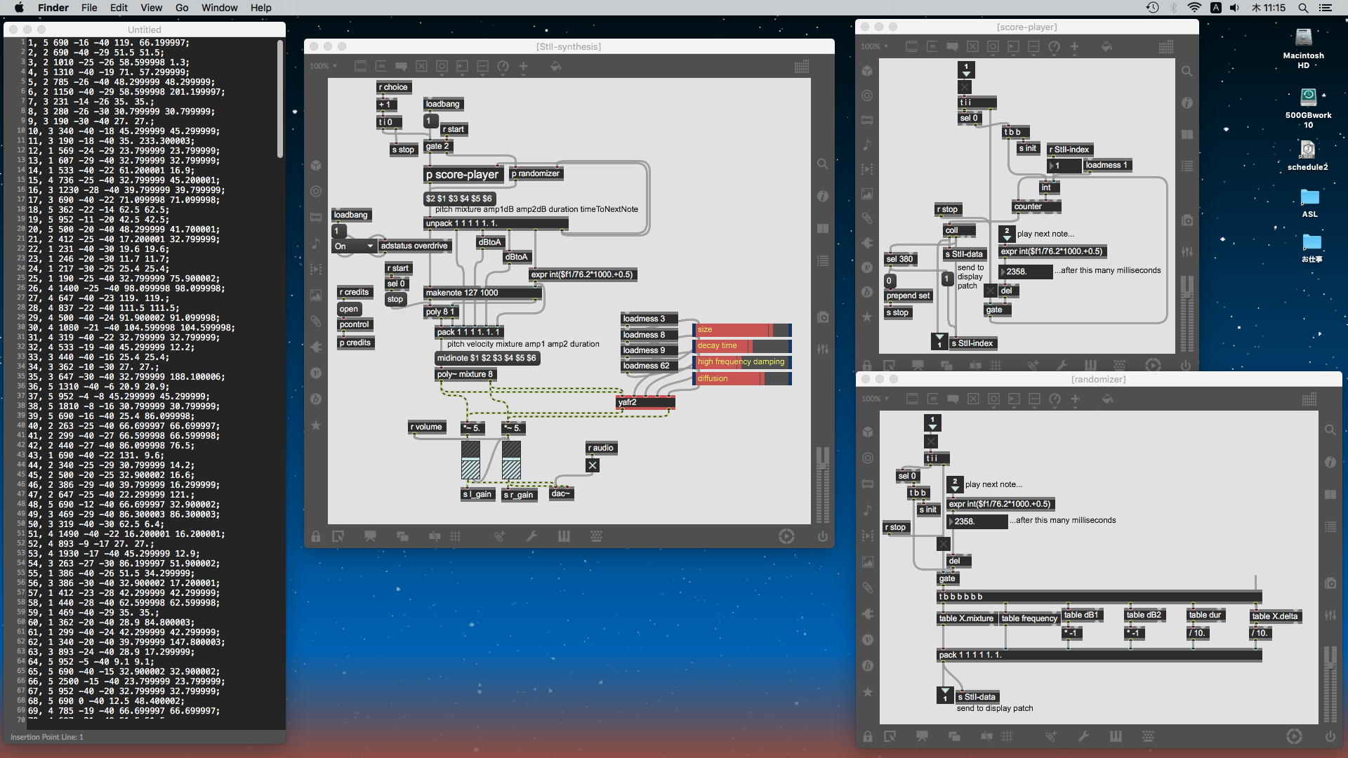 2023年には、 Sketching日記(18) の翌日の「2023年8月16日(水)」によれば、12月に開催された Final Lecture/Workshop by YN の枠組みがおよそ完成したようで、さらに上のように、院生の王さんの研究に関しての実験(SuperColliderとMaxとの連携)も進めていた。