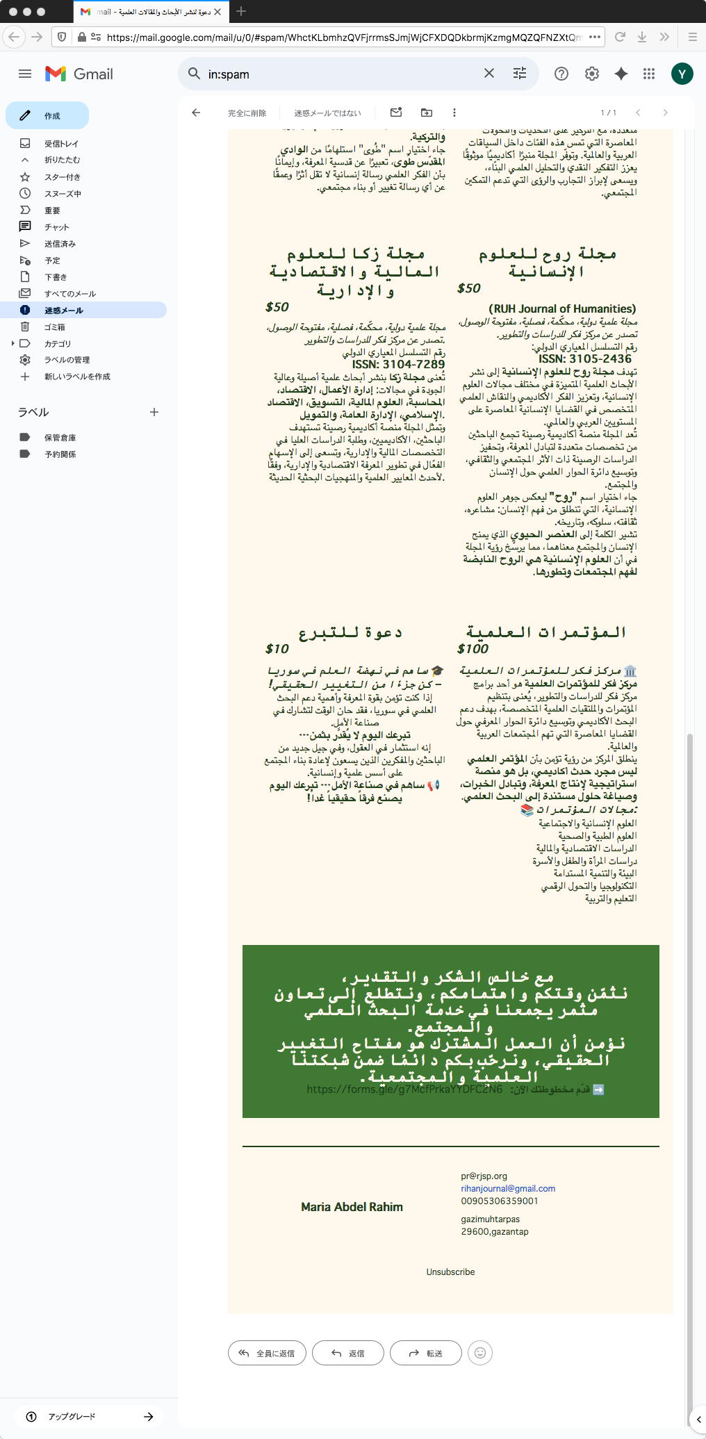 昨夜、最後のメイルチェックで届いていたのは以下のような謎のメイルだった。 「Journal」とあるので、まぁいつもの禿鷹ジャーナルなのだろうが、アラビア語?なので全く読めない。 そういえばGmailなのでGoogle翻訳で観れるかな・・・と思ったが、既に、無条件反射で(ゴミ箱でなく)「迷惑メール」消去してしまっていたので変換できなかった。 ここからのメイルは2度目らしいのだが、前回も同様に消去後に「シマッタ」と思っていたのだった。 まぁ、これだけエピソードを重ねれば、もし次の3回目が来れば「初めてのアラビア語自動翻訳」を紹介できるかもしれない。