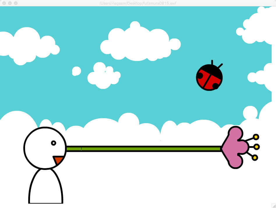 2005年には8/13から8/17まで5日間、ゼミの4人+1人を対象とした「夏休みFLASH特訓講座」をやっていた。 8月15日にはActionScriptの基礎をやり、この日のテーマはFlashムービーのLoaderの試作だったようで、5人がそれぞれFLASHのローディングタイマを実装していた。 上の作品は 二村さん のもの(Loaderのラストシーン)である。