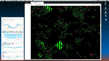 ロボット教室のRP1(1年目ロボプロ)の今月のテキストを調べてみると、来月のターム5回目には「8*8ドットマトリクスLED」の点灯サンプルとして「LIFEゲーム」を扱っている・・・と知った。 ただし、縦横8ドットでの描画にはだいぶ無理があるので、教育的にはパソコンぐらいの解像度は欲しい。 そこでネットで「life game」と検索して出てきたWeb版(ブラウザで体験できる)ものを、とりあえず以下に並べることにした。 順番は「検索で出てきた順」なので、使い勝手などの優劣とは別である。 特にちょっとユニークなのは これ で、以下のように異常に高解像度であり(CPU温度もグングン上がる)、「フルスクリーン」にも「無限モード」にも対応している。 これはかなりのこだわりである。