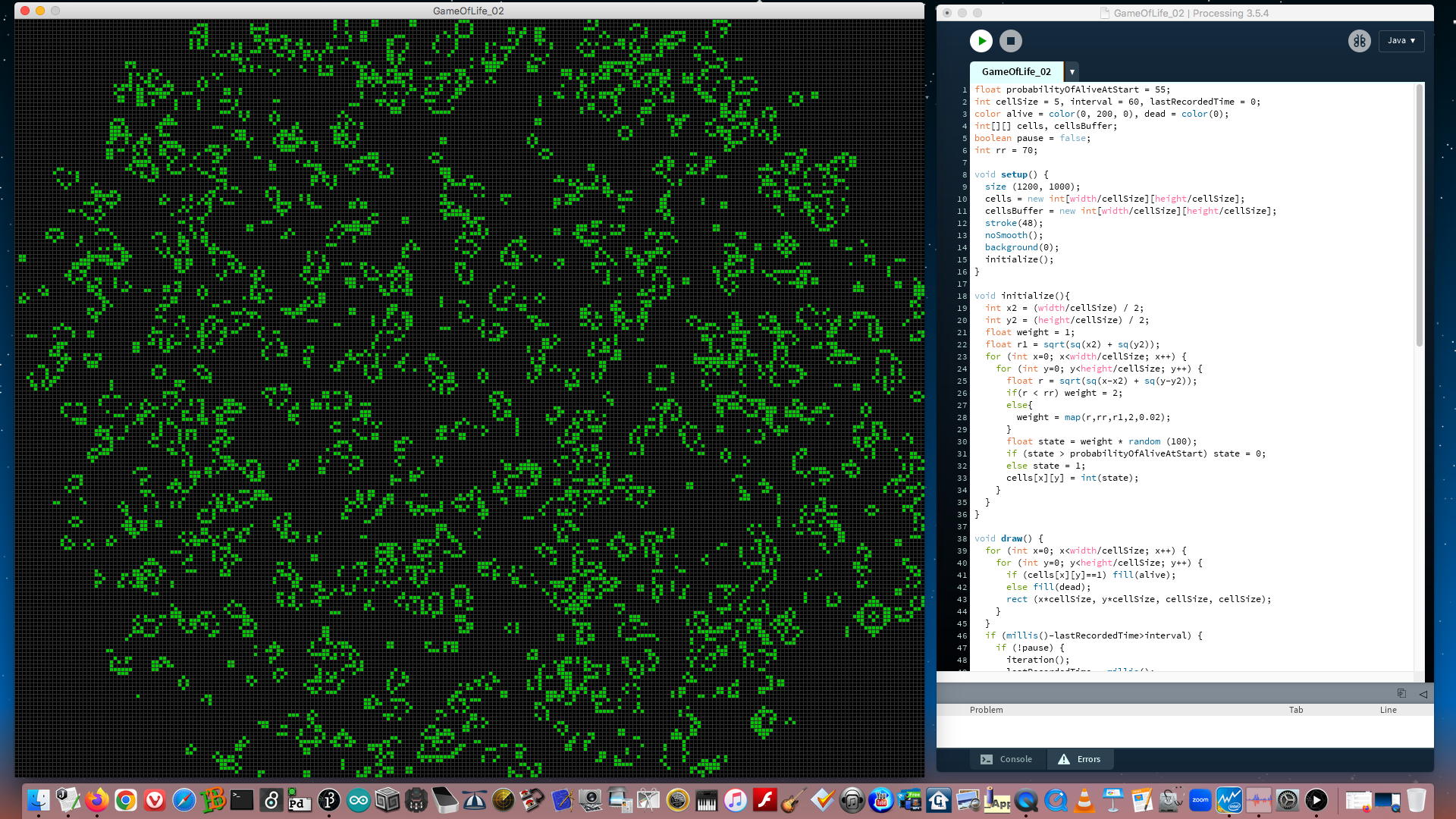 今日は特例で、午後にJoyJoyヒトカラの予定となっている日である。 昨日のProcessingによるLife Gameについては、スペースキーでpauseをかけた時にマウスドラッグでセルを塗り潰せるのだが、そのセルが既に生きている場合には反転して死ぬという仕様になっていたのに気付いて、朝イチで「マウスカーソルがかかったセルは全て生きる」というように変更した。
