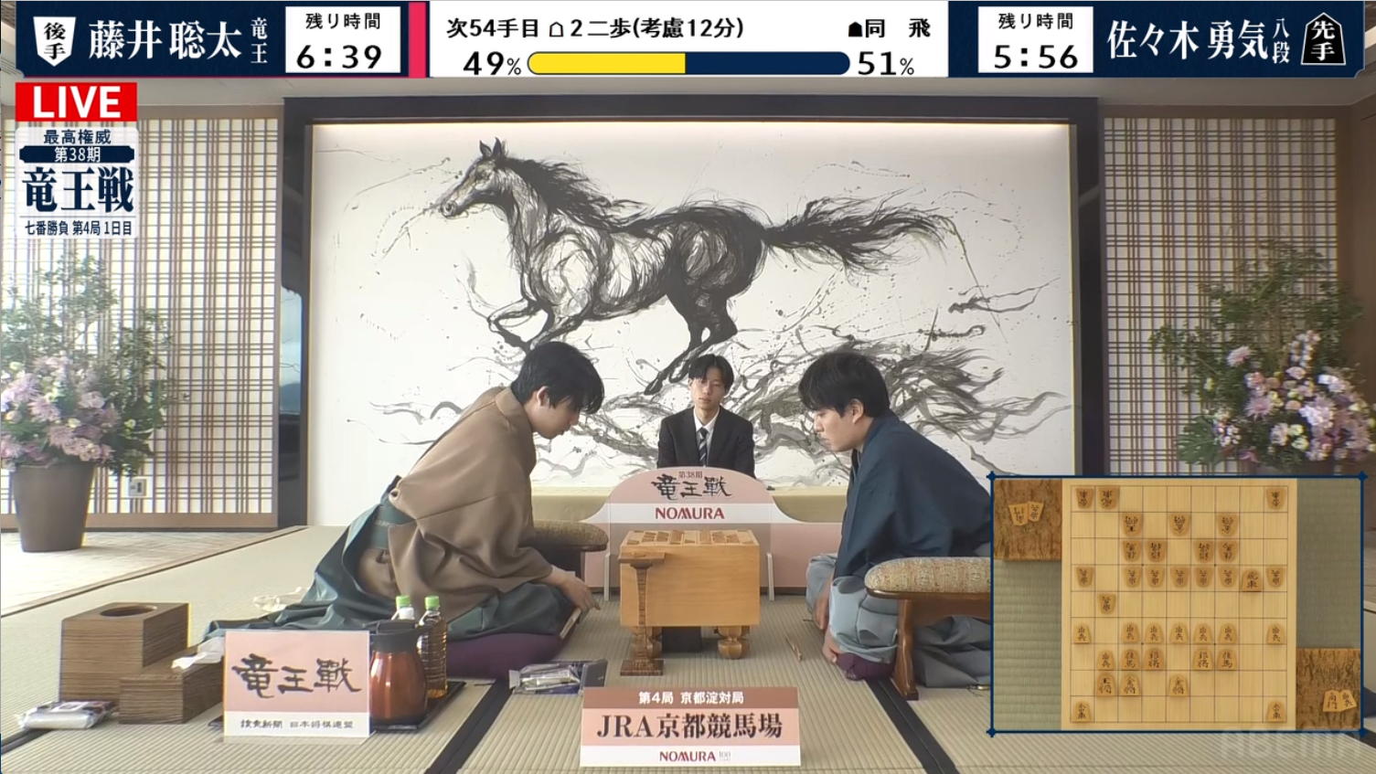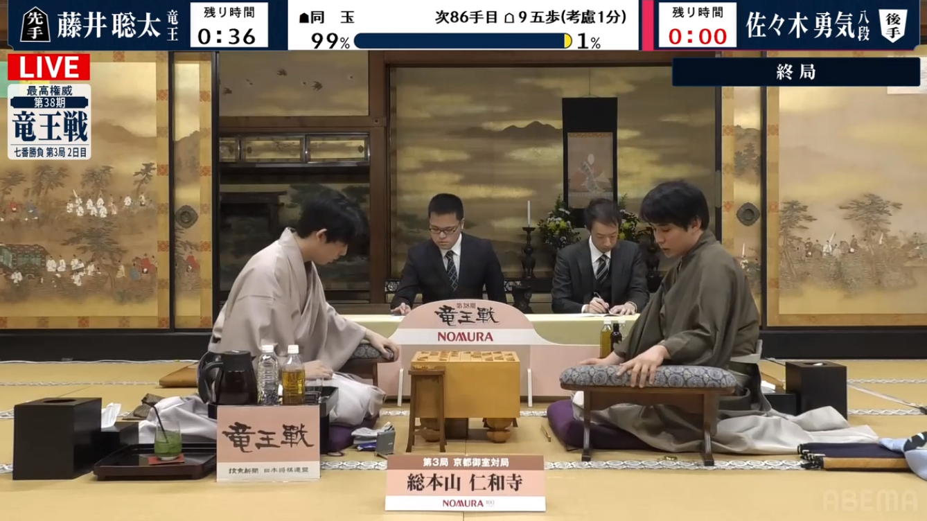 そして竜王戦第4局2日目の朝となった。 考えてみればここで勝つと、藤井竜王は単にタイトル保持というだけでなく、5期連続の「永世竜王」となり、それも渡辺九段の記録を抜いて最年少永世竜王という記録となるのだった。 AbemaTVの生中継を見てみると、なんと立会人の並びにレジェンド武豊騎手の姿もあった。