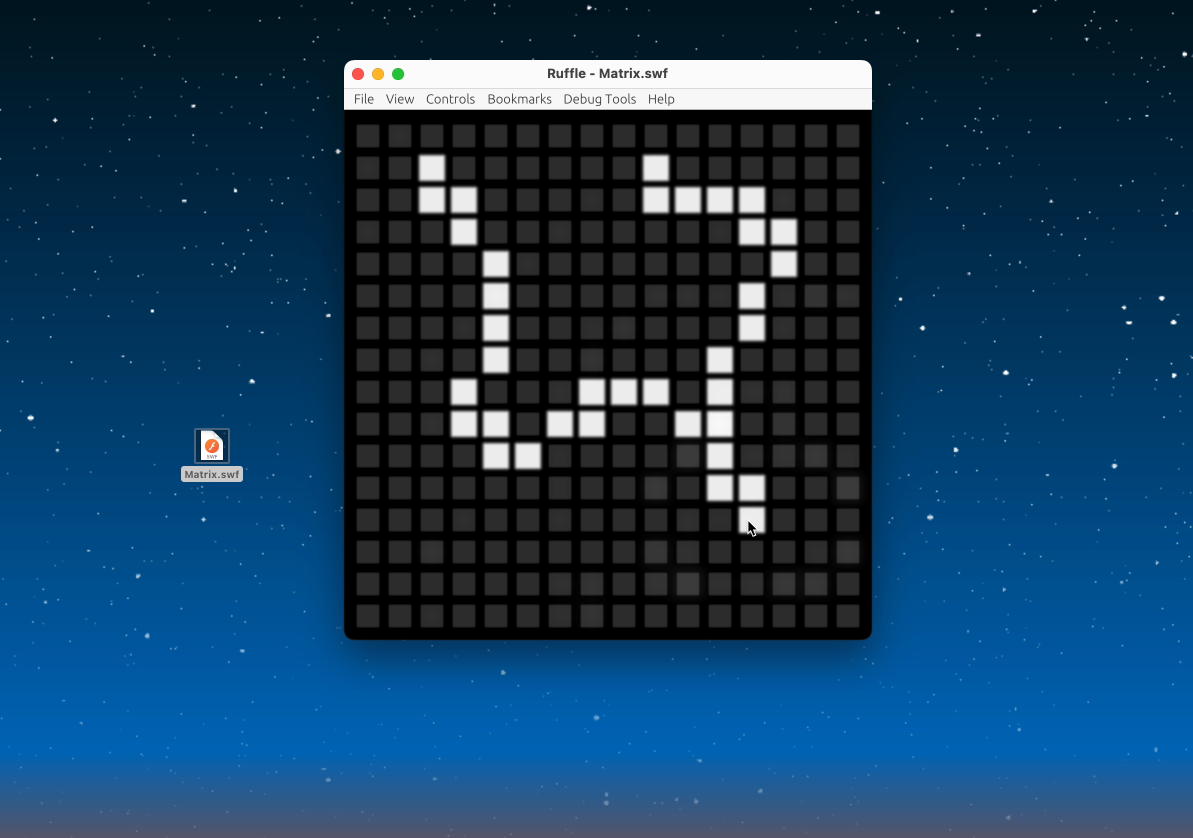 今週はロボット教室の「谷間」なので予定が空白の日々が続く。 そこで、うまくいかないままだった RRR日記(9) の「2025年10月29日(水)」の最後あたりに置いた Matrix.swf について、決着を付けるべく実験してみた。 元々は以下( この動画 )のように、「FlashコンテンツをFlashPlayerで走らせる」というだけの事である。