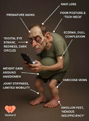 そしてネット記事としては、 ChatGPTを使ったAI学習は「浅い理解」しか生まない:最新研究が解き明かす知の危機とは というものもあった。 まぁ、中身としては「当たり前田のクラッカー」なのだが、研究者が行った実験のプロセスは明瞭で、「(1)LLMグループ: ChatGPTのような大規模言語モデル(LLM)を使い、AIが生成した要約から情報を得る、(2)Web検索グループ: Googleのような従来の検索エンジンを使い、表示された複数のWebサイト(リンク)を自分で閲覧して情報を集める」という2群で行った。米国のポイ活アプリ「WeWard」は「今のように座りっぱなしの生活を続ければ、2050年の私たちはどうなるのか」というテーマでAIモデルを提示した。 このモデルは、世界保健機関(WHO)や米疾病対策センター(CDC)などの関連資料を収集し、それをChatGPTに入力して生成したものだ。 WeWardは、AIが予測した人物を「サム(Sam)」と名付け、「運動不足が身体の外見と健康に及ぼす影響を医学的に視覚化した結果」と説明した。 公開されたサムの姿は、長時間の座式生活で消費カロリーが少なく、新陳代謝が低下して腹に脂肪が蓄積し、腹部肥満になっている。長時間、前かがみの 姿勢でスマートフォンを使ってきたため、背中は丸まり、頭部が前方に傾き、いわゆる“猫背”の状態だ。目は充血している。 臀部や膝などの関節も硬くなり、血液循環が悪いため足首や足はパンパンにむくんでいる。また、座りっぱなしの生活による疲労や血行不良、栄養バランスの 乱れによって髪の毛は細くなり脱毛が起こり、血管の健康も悪化して肌のハリを失い、色素沈着が進んでいる様子だ。 WeWardは「WHOの調査によれば、青少年の80%が推奨される身体活動量を満たしていない」とし「食事の注文、会議、友人との会話まですべてソファの 上で済ませ、SNSでコンテンツを見る時間まで合わせると、私たちはほとんどの時間を画面の前で座って過ごしている」と指摘した。 さらに「身体活動の不足は、心臓病、脳卒中、糖尿病、がん、認知症の発症リスク増加などの健康問題と直接的に関係しており、睡眠、筋肉・骨の発達、 うつや不安に至るまで、日常生活の質に影響を与える」と強調した。 そして「今回のプロジェクトは、単に恐怖をあおるためのものではなく、現代人がいかに動かない生活をしているかを警告する試み」とし「もし動かなければ、 私たち全員が“サム”のようになってしまう」と警鐘を鳴らした。