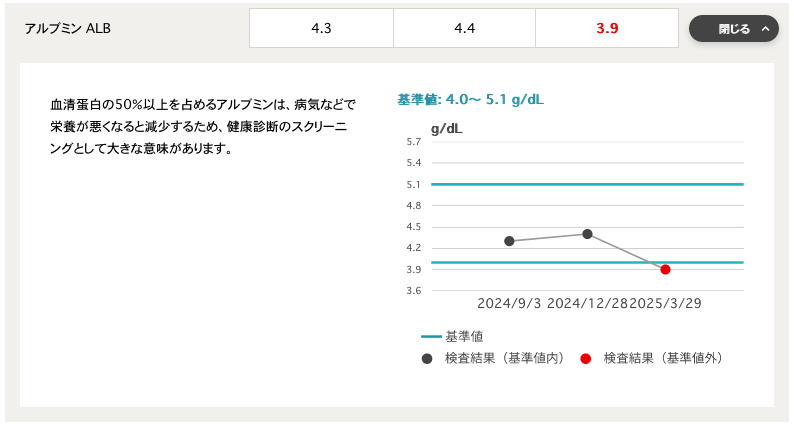 1項目だけ、「アルブミン」が規定外だったのだが、以下のようにギリギリ低いだけであり、それ程、心配は要らないらしい。 昨日も盛大に「飲み歌い」してきた事もあり(医師には言わなかったが(^_^;))、まぁ肝臓に負担がかかっていたのは自覚ありなのだ。