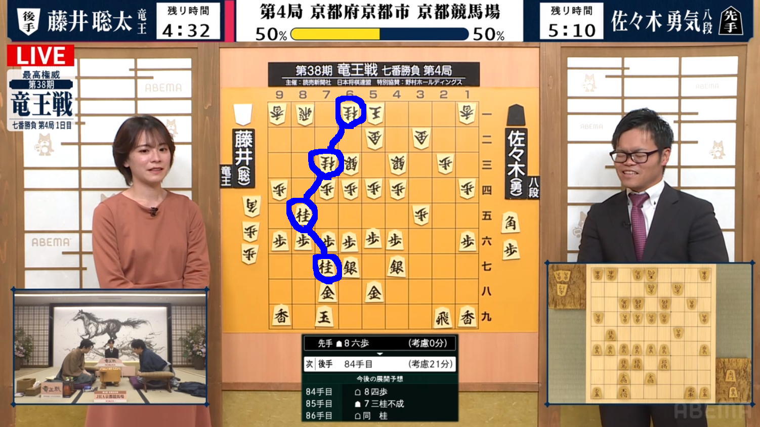 竜王戦は午後も両者の評価値が50%のまま、夕方までじりじりと推移していった。 途中で藤井竜王の右玉が初期位置の51に戻って、さらに両者の4枚の桂馬が全て上のように「桂馬繋がり」で繋がったり・・・と、競馬場対局らしく「馬」が主役で推移していった。 そして結局、AbemaTVで隣のチャンネルで並行していた麻雀LIVE中継の2件をCMの時間中に見たりしつつ、85手での封じ手まで見届けた。