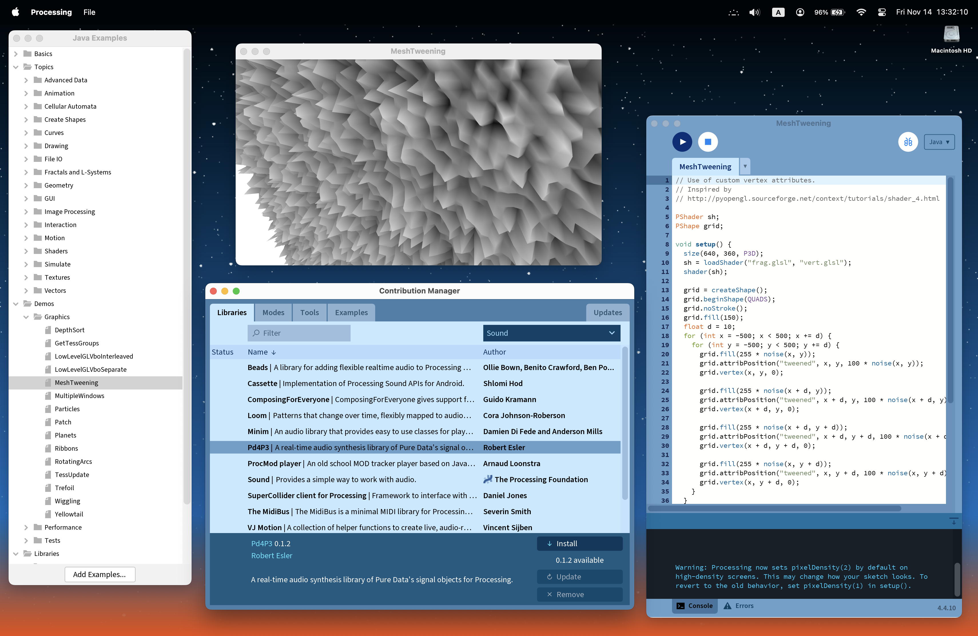 今日は晩にロボット教室に出掛ける予定しかないので、上のように、新MacBookAir(MacOS 15.7.1)にProcessingを入れてみた。 最新のProcessingはVersion4.4.10となっていたが、適当にサンプルスケッチを呼び出すと、ちゃんとライヴ・グラフィクスが走ってくれた。 ウインドウの外見(色)などが変わっていたものの、まぁProcessingのIDEはArduinoと似たようなものなので、操作性は変わっておらず安心した。