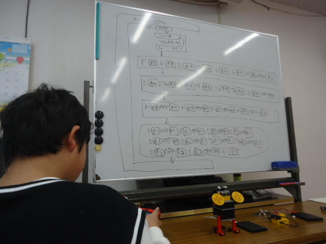 そして生徒はホワイトボードに僕が書いた長大な「楽譜」プログラムを打ち込んで、そのマイコンブロックを使って「自由にロボットにしよう」という特別テーマで制作してもらった。 その結果、上のように、僕のロボットと臨時組み立てロボットと生徒のロボットでの3体による「輪唱」が成立することになった。 現場で2回、一発撮りしたのが この動画 と この動画 である。 まぁまぁ、特殊なケースとなったのだが、この生徒には持参したロボプロRP1の リンクロボット も特別に操縦してもらったりして、「特別な日」を無事に乗り切ることが出来た。